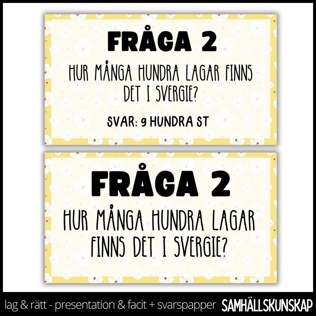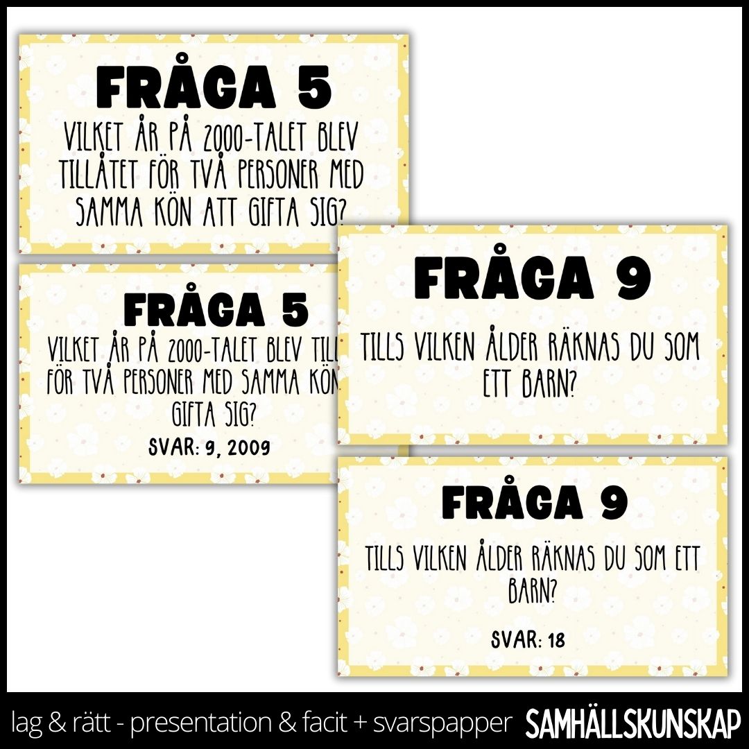 Låt eleverna öva eller visa sina kunskaper inom ämnet samhällskunskap och området lag och rätt med hjälp av detta spelet och presentationen. Spelet är inspirerat av spelet 0-100. Låt eleverna gissa på en siffra mellan 0-100 på presentationens 10 olika påståenden. Spelet handlar om att få så få poäng som möjligt. För rätt svar får eleven -10 poäng, och för varje fel svar får eleven så många poäng som gissningen diffa från det rätta svaret. Låt eleverna tävla enskilt, i per eller i grupp.