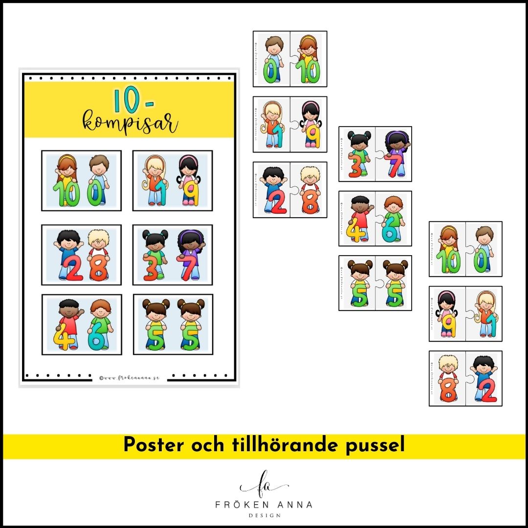 Poster med 10-kompisarna och tillhörande pussel där 10-kompisarna matchas ihop.