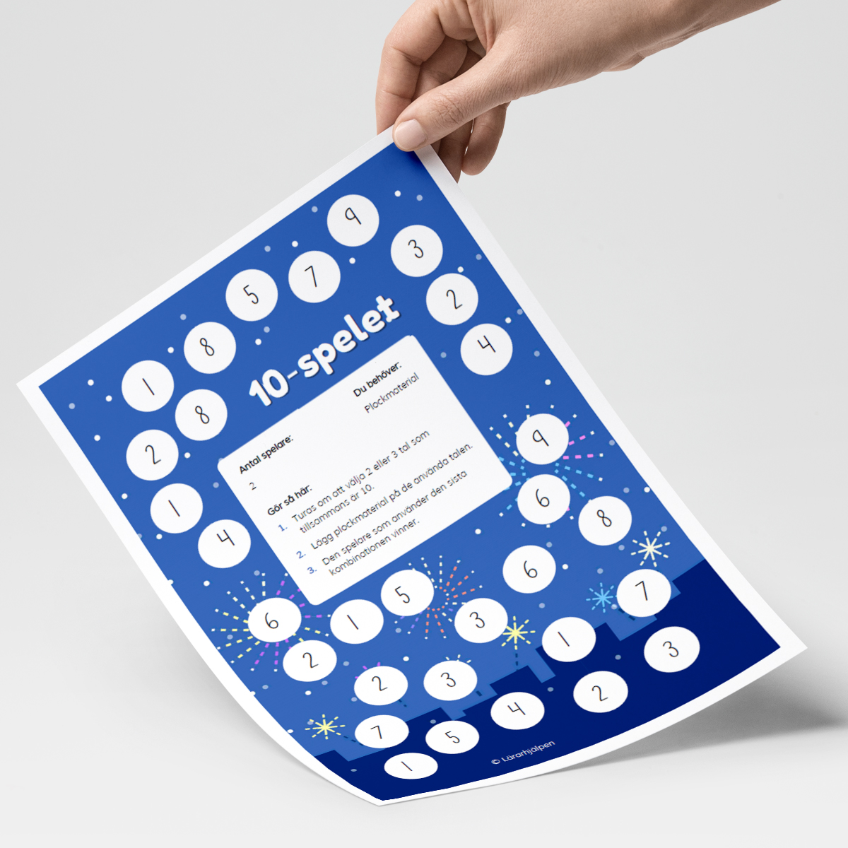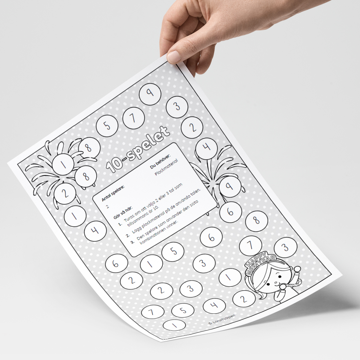Ett spel som tränar talområdet 0–10 med två och tre termer. Spelregler finns beskrivna i dokumentet. Inkluderar både en version i färg och en svartvit.