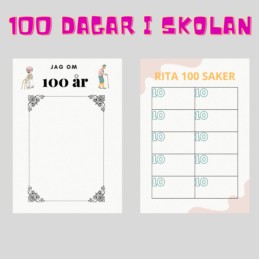 100 dagar i skolan innehåller ett diplom som kan lamineras och delas ut till samtliga elever. Dessutom får de möjlighet att utforska sin fantasi och självreflektion genom ett arbetsblad med en utmaning att rita och fundera över sitt framtida jag efter 100 år. Det medföljer även ett arbetsblad där eleverna uppmanas att rita och lista 10 olika föremål i varje ruta för att uppnå totalen 100.