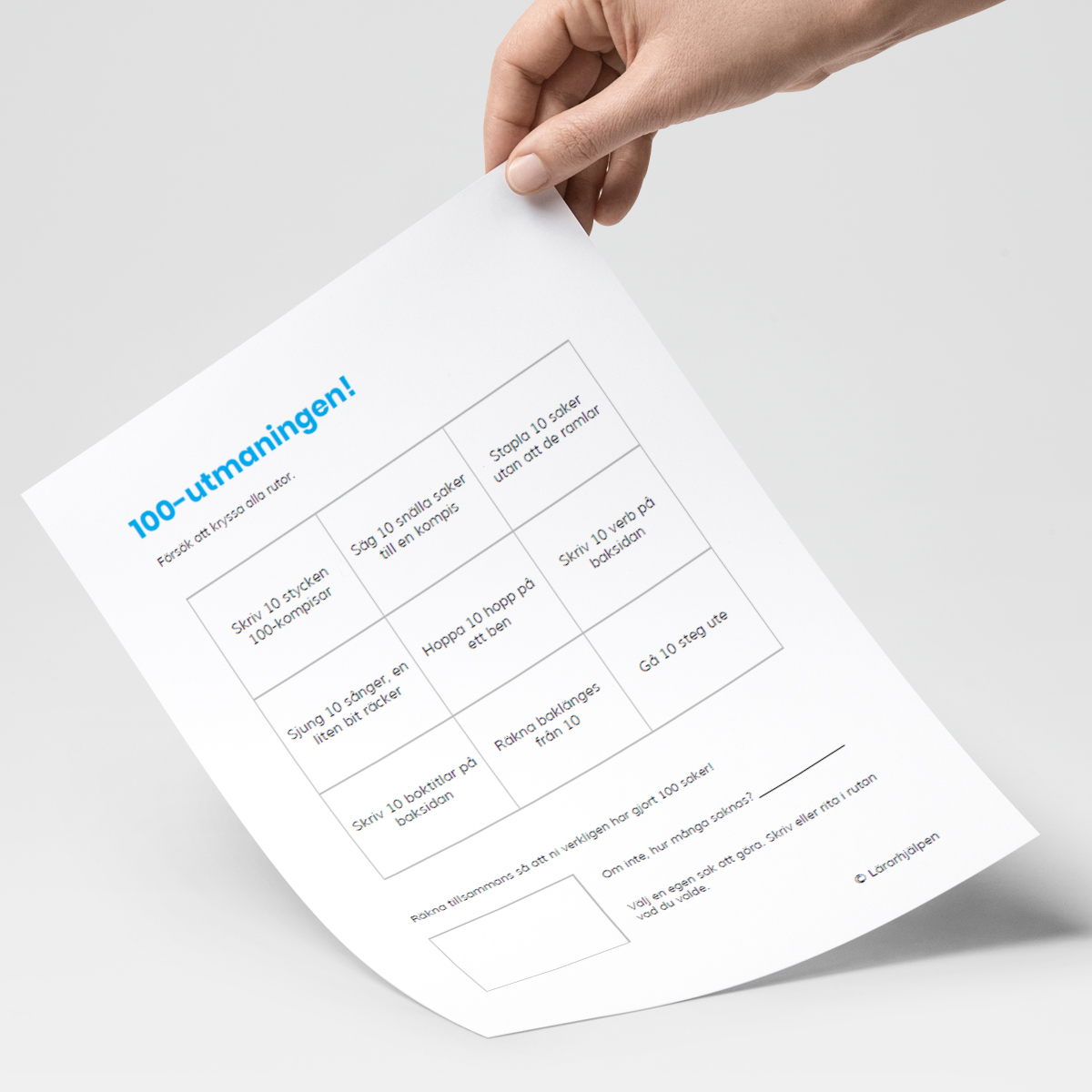 Dokumentet är tänkt att använda när eleverna har gått 100 dagar i skolan. Eleverna kan utföra utmaningarna i helklass, grupp eller enskilt.
