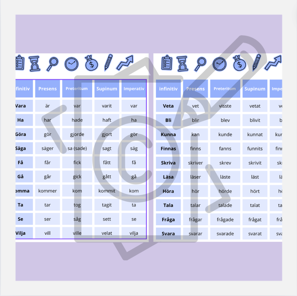 Detta är 10 a4-papper med 100 vanligaste verben i svenska språket.