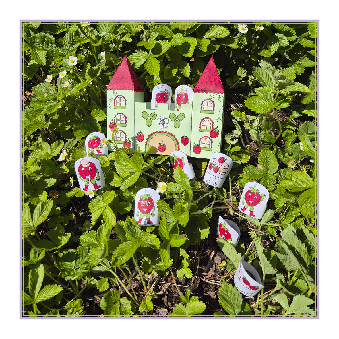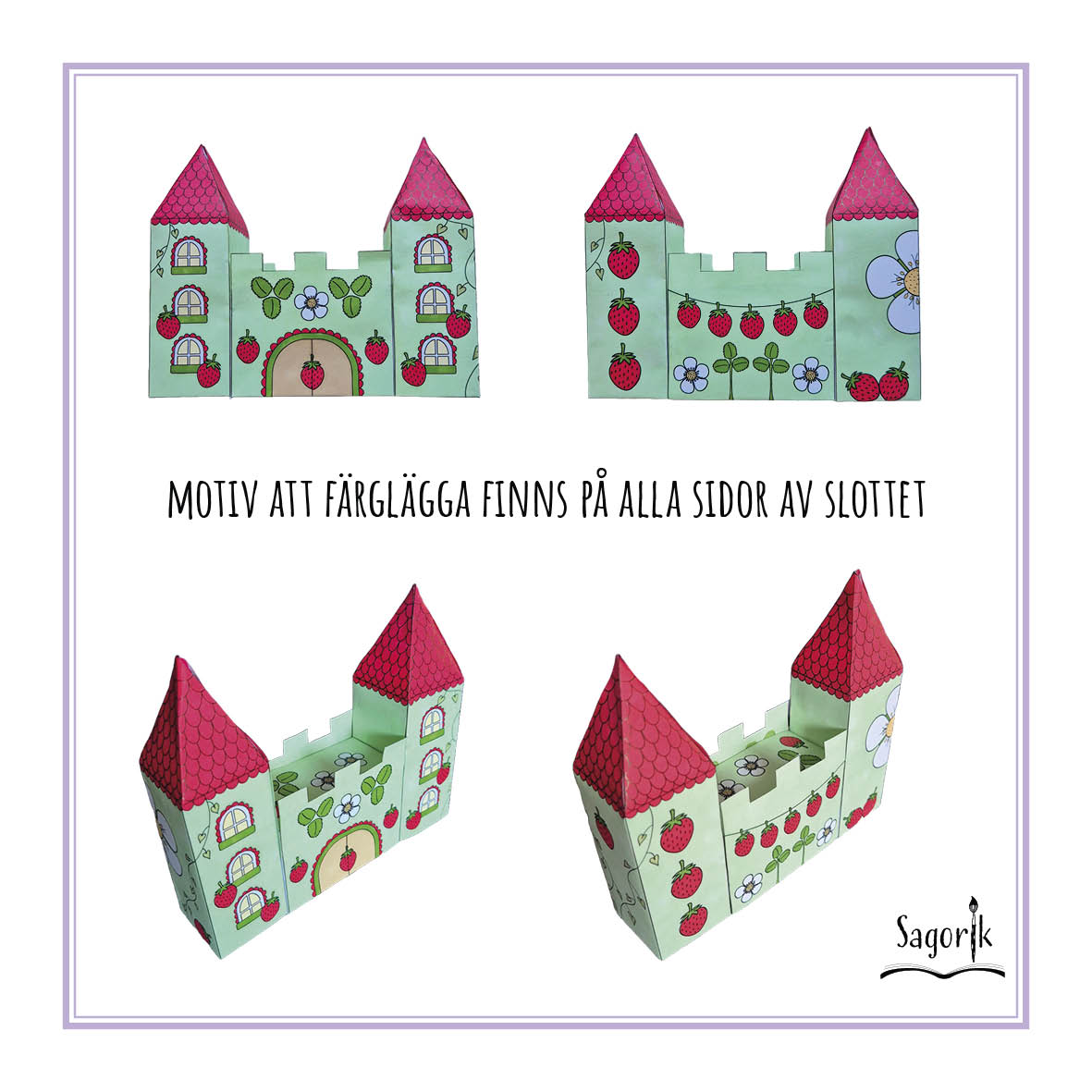 Detta är ett roligt och kreativt pyssel där du får bygga ett slott av papper! Skriv ut, färglägg, klipp ut och montera. Sedan har du en egen liten värld redo för barnens fantasifulla lekar och berättelser. Motiv finns på alla sidor av slottet. Ge barnen härlig sommarkänsla med detta jordgubbsslott! Även perfekt pyssel till midsommarfesten eller att ge som pysslig midsommarpresent till barnen.