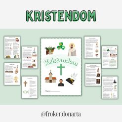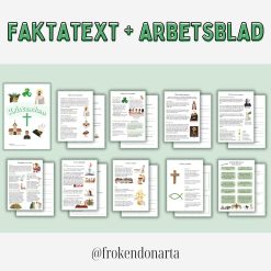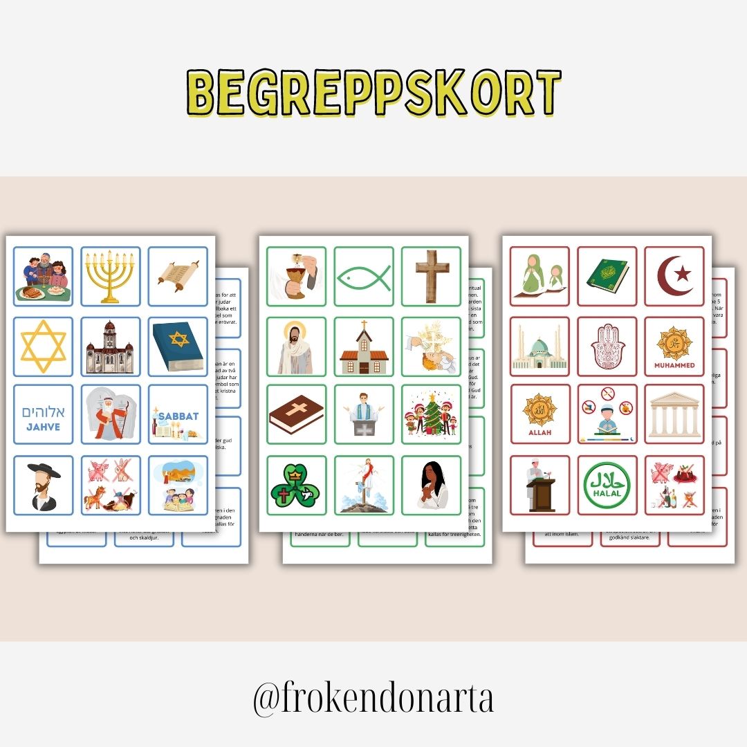 2) Tre sidor med begreppskort, en för varje religion. Varje sida med begreppskort har en baksida med förklarningar till bilderna. Texten är spegelvänd. Detta för att rätt beskrivning ska hamna bakom rätt bild när man skriver ut ”dubbelsidigt”.