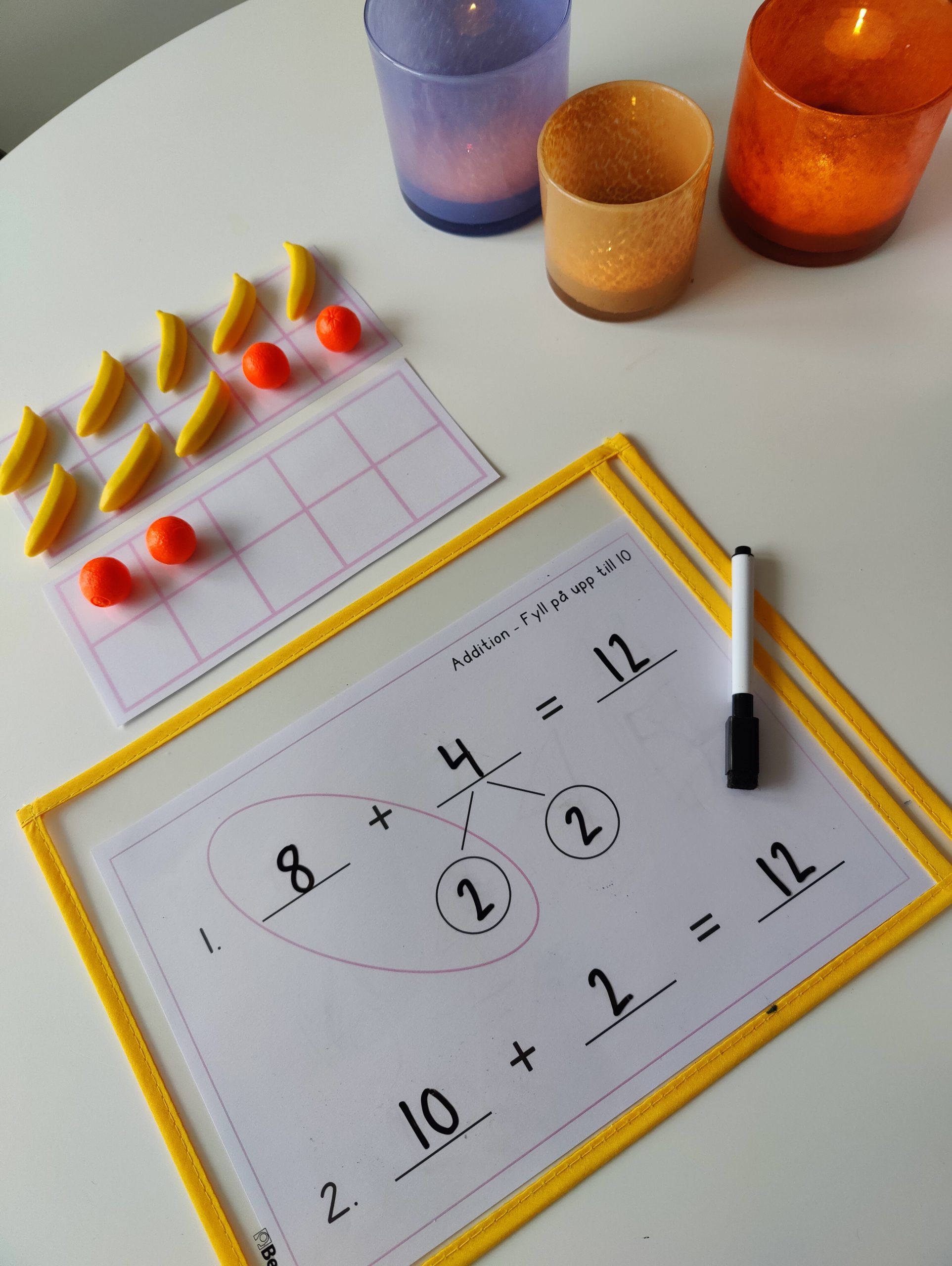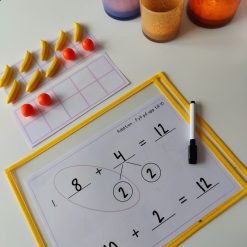 Vid addition – Låt eleven lägga talen i tioramar för att sedan fylla upp till 10 i den ena och skriva upp hur många det då är kvar i den andra.