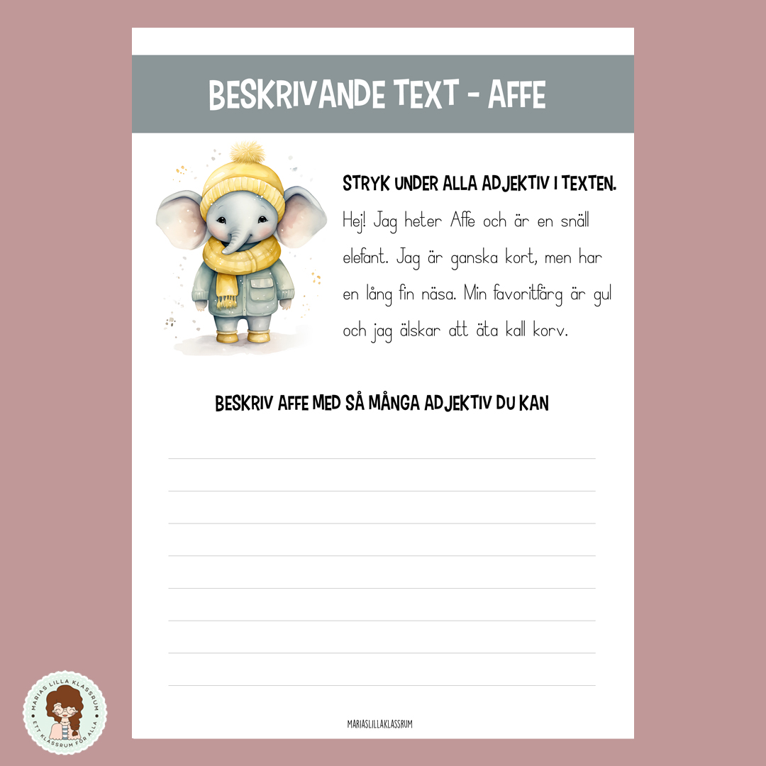 Enkel text om Affe. Läs och stryk under alla adjektiv.