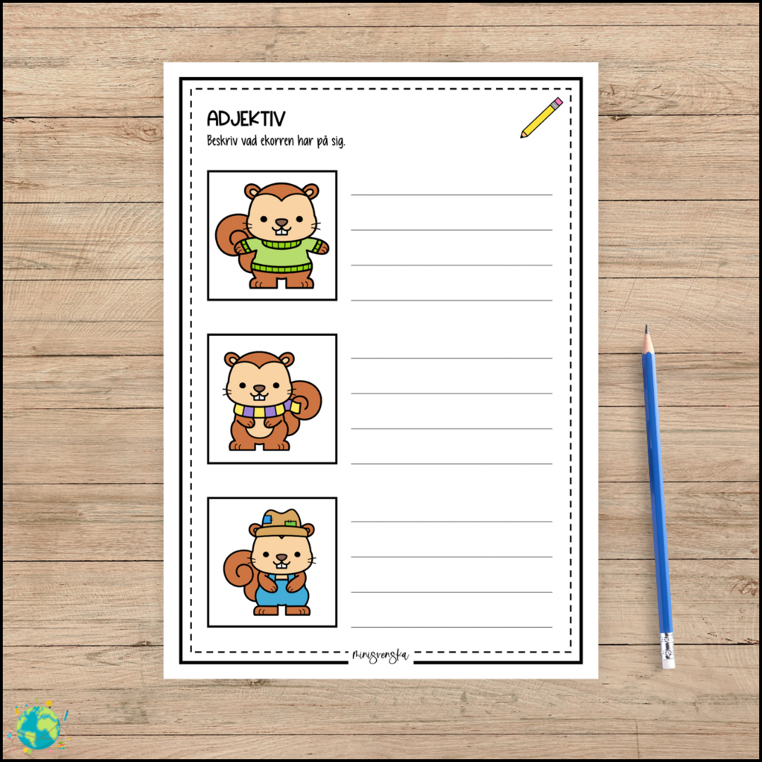 Ett lekfullt och höstligt material där eleverna tränar på att använda adjektiv genom att beskriva vad ekorren håller i eller har på sig!