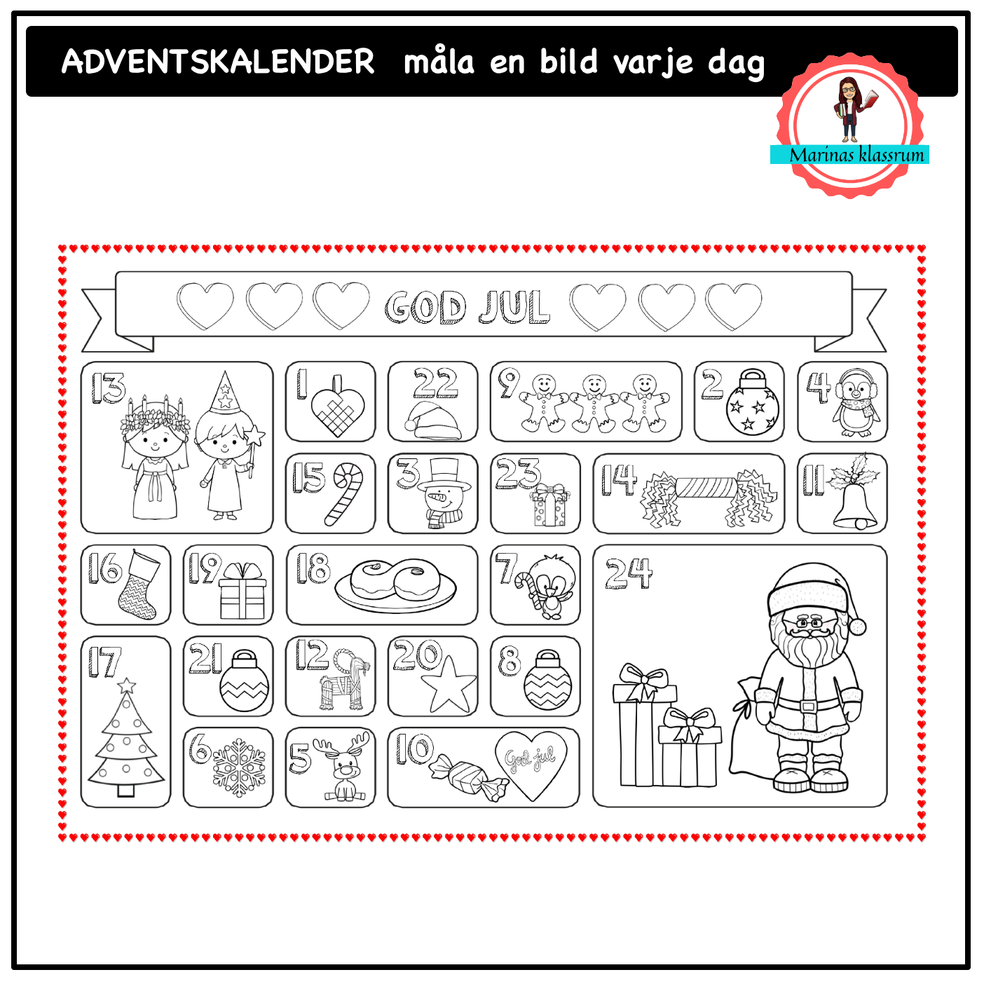 En julkalender för eleverna att färglägga. Kan kopiera upp större i A3 om så önskas.