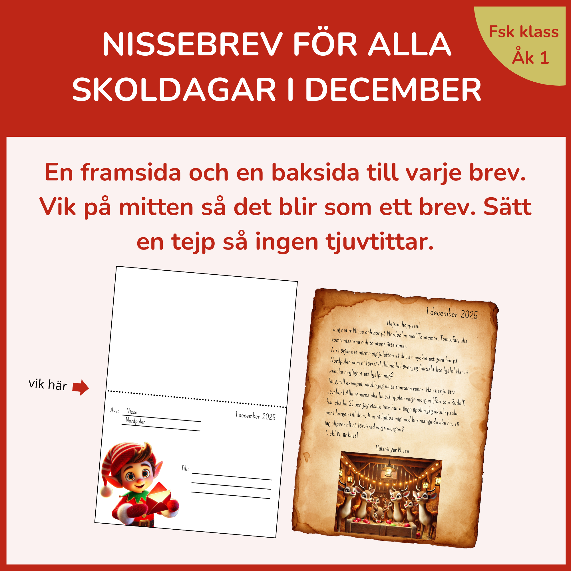 15 Nissebrev från tomteverkstan på Nordpolen. Ett brev för varje skoldag i december med enkla mattefrågor och en sammanhängande berättelse. Passar förskoleklass och åk 1.