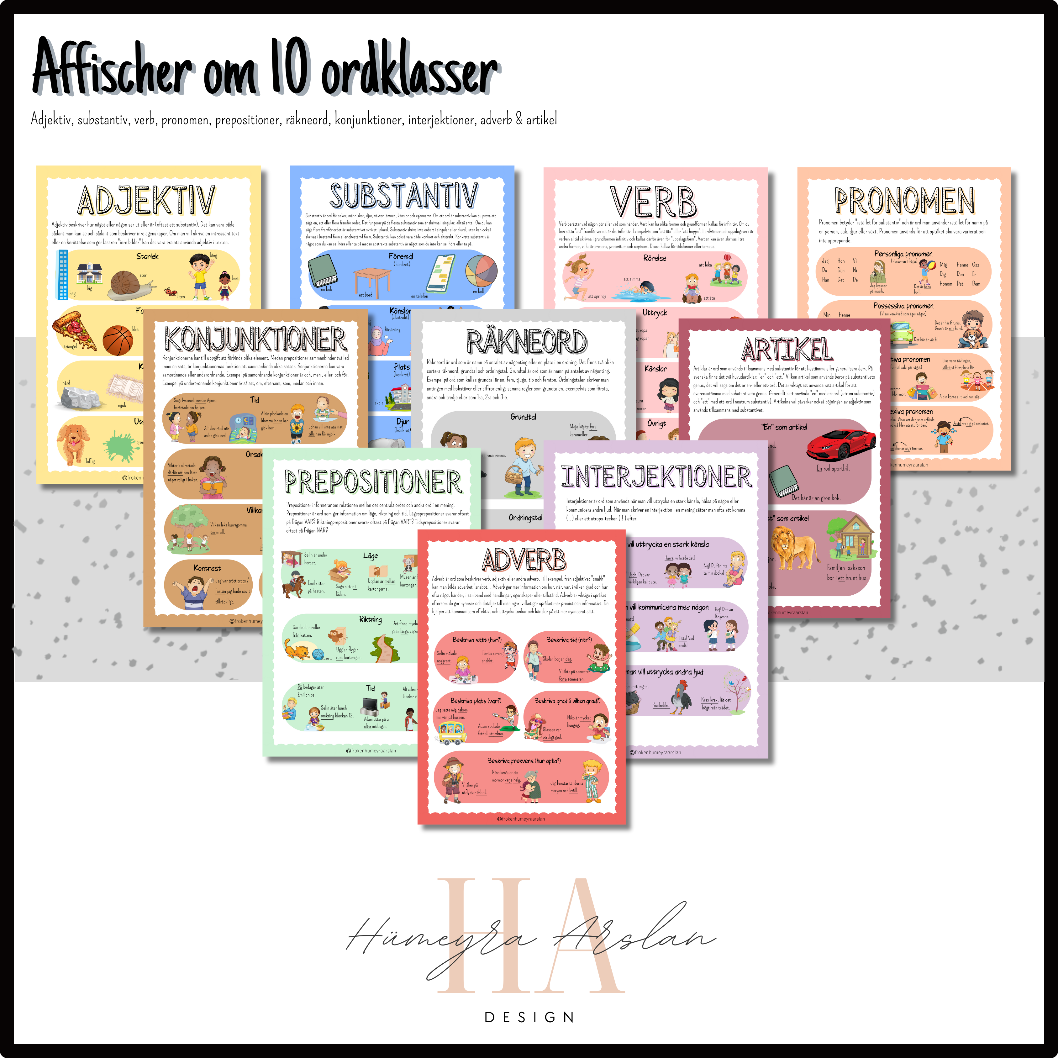“Affischer om 10 olika ordklasser” är ett materialpaket som innehåller hela 10 affischer (A3-format) om olika ordklasser. Dessa affischer kan bli ett bra hjälpmedel för eleverna när de ska börja med ny ordklass men också fungera som ett stöd under arbetets gång.