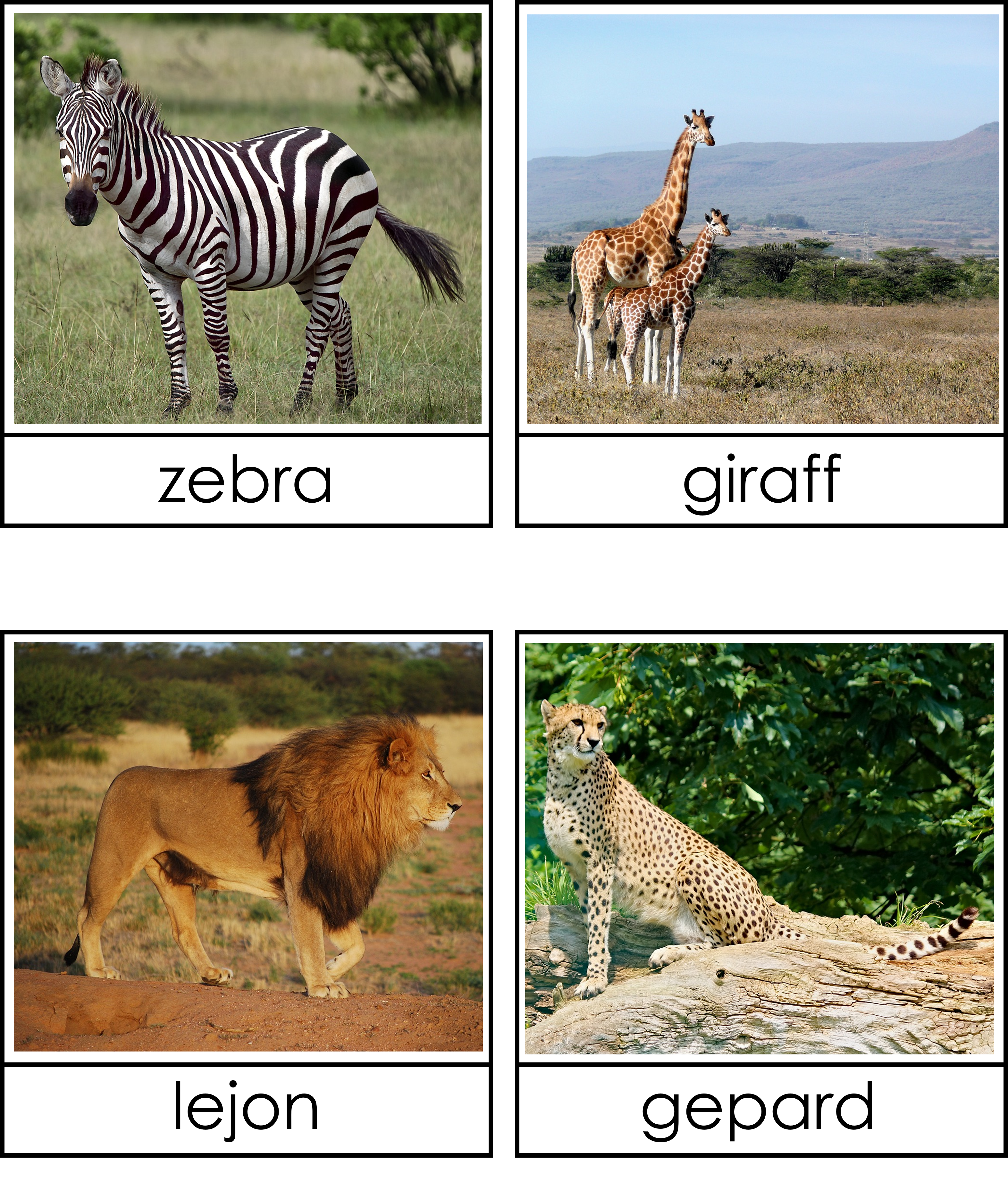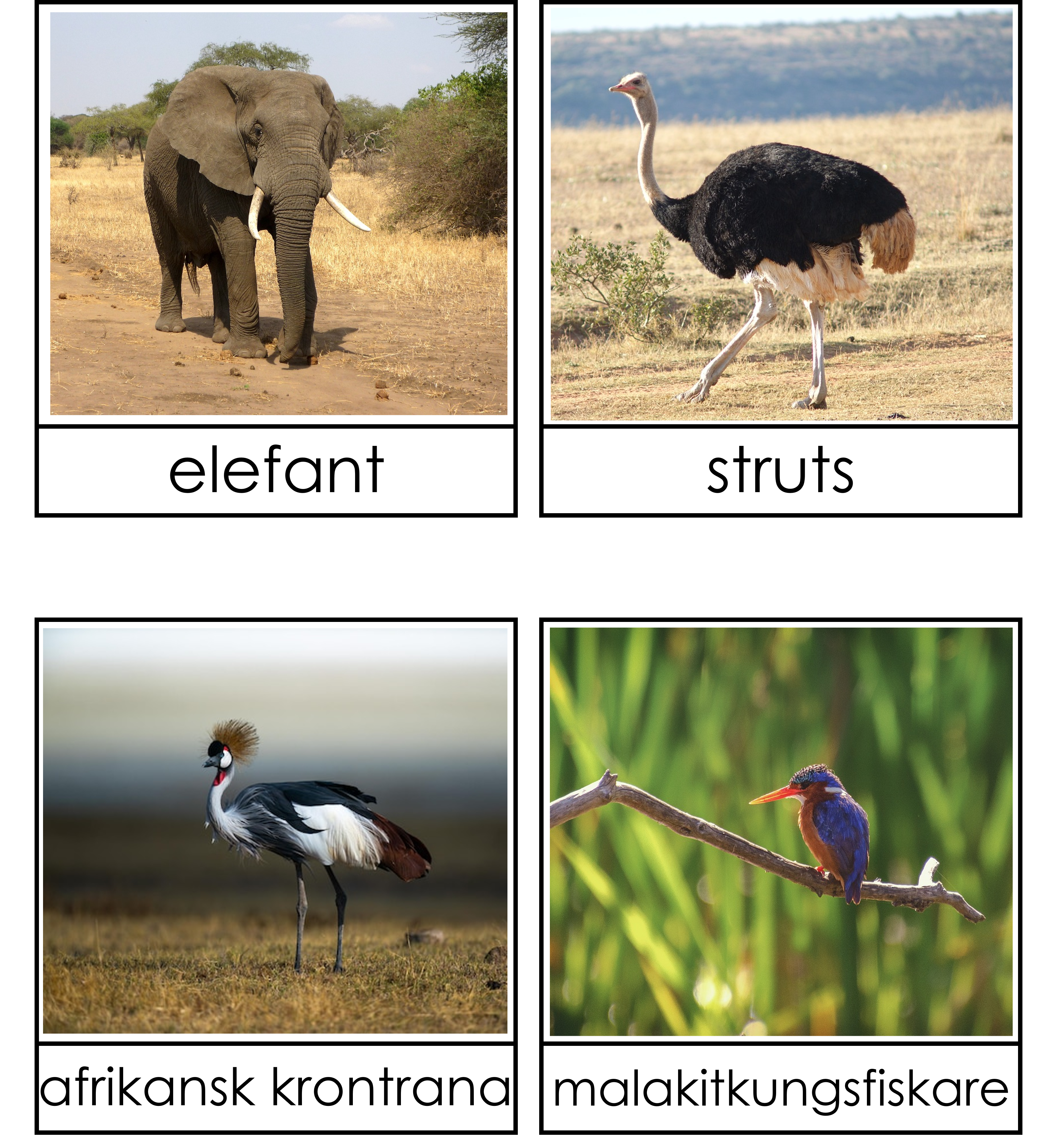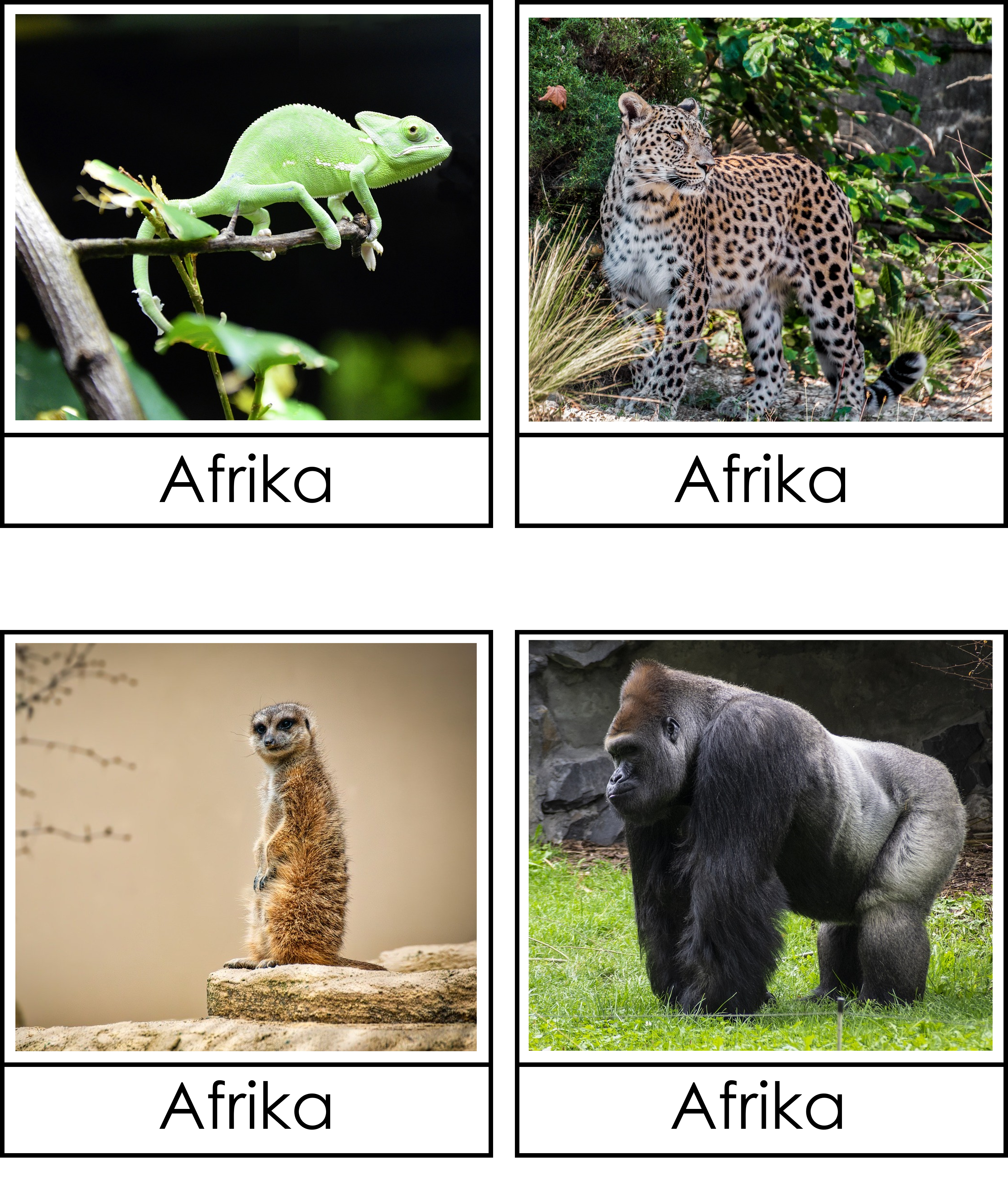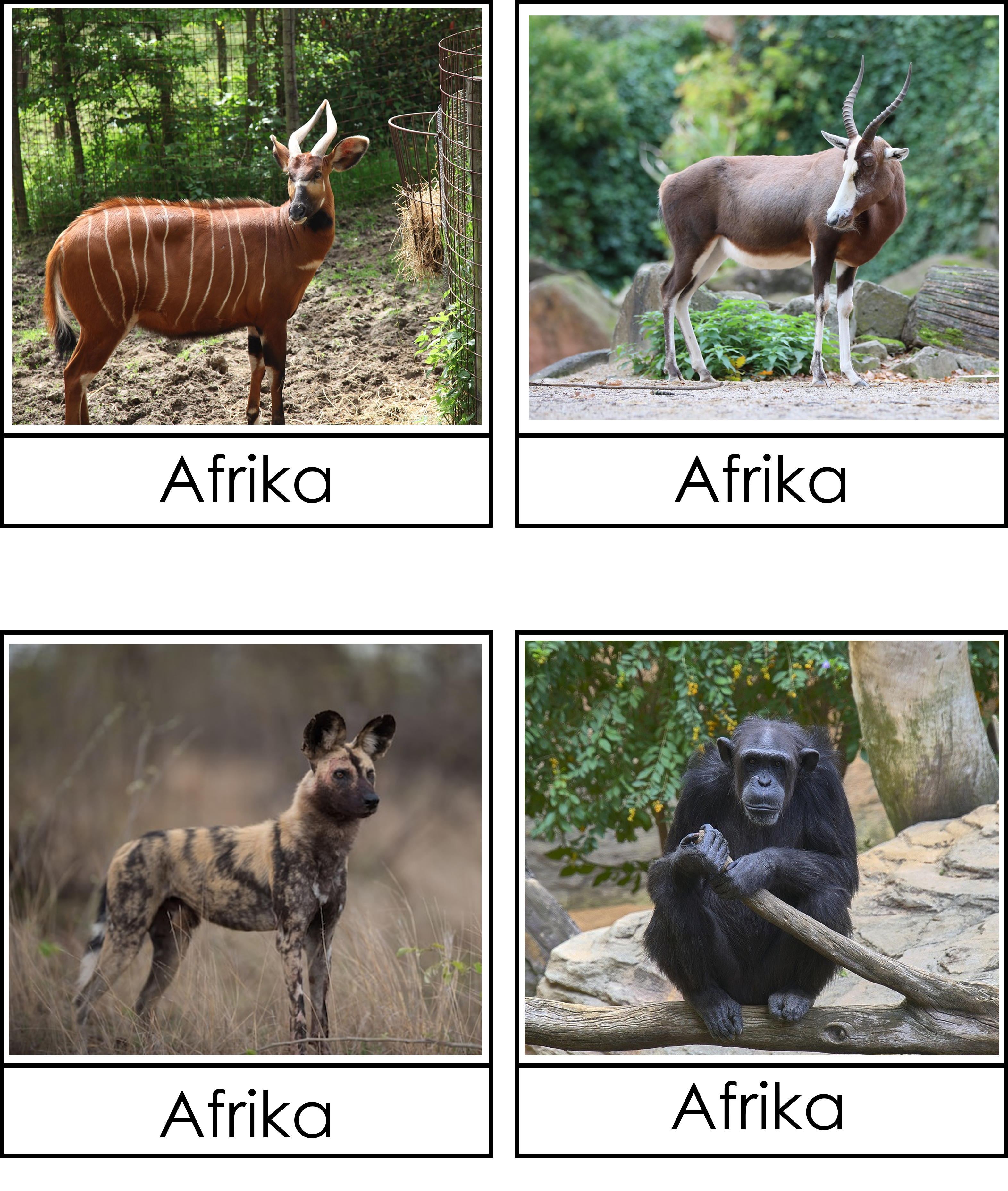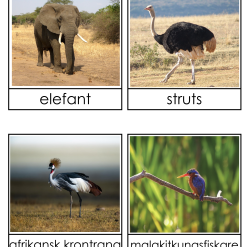 Materialet innehåller 22 djurkort där djurets namn står och 22 djurkort där det står Afrika.