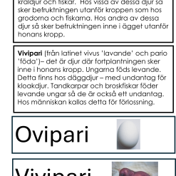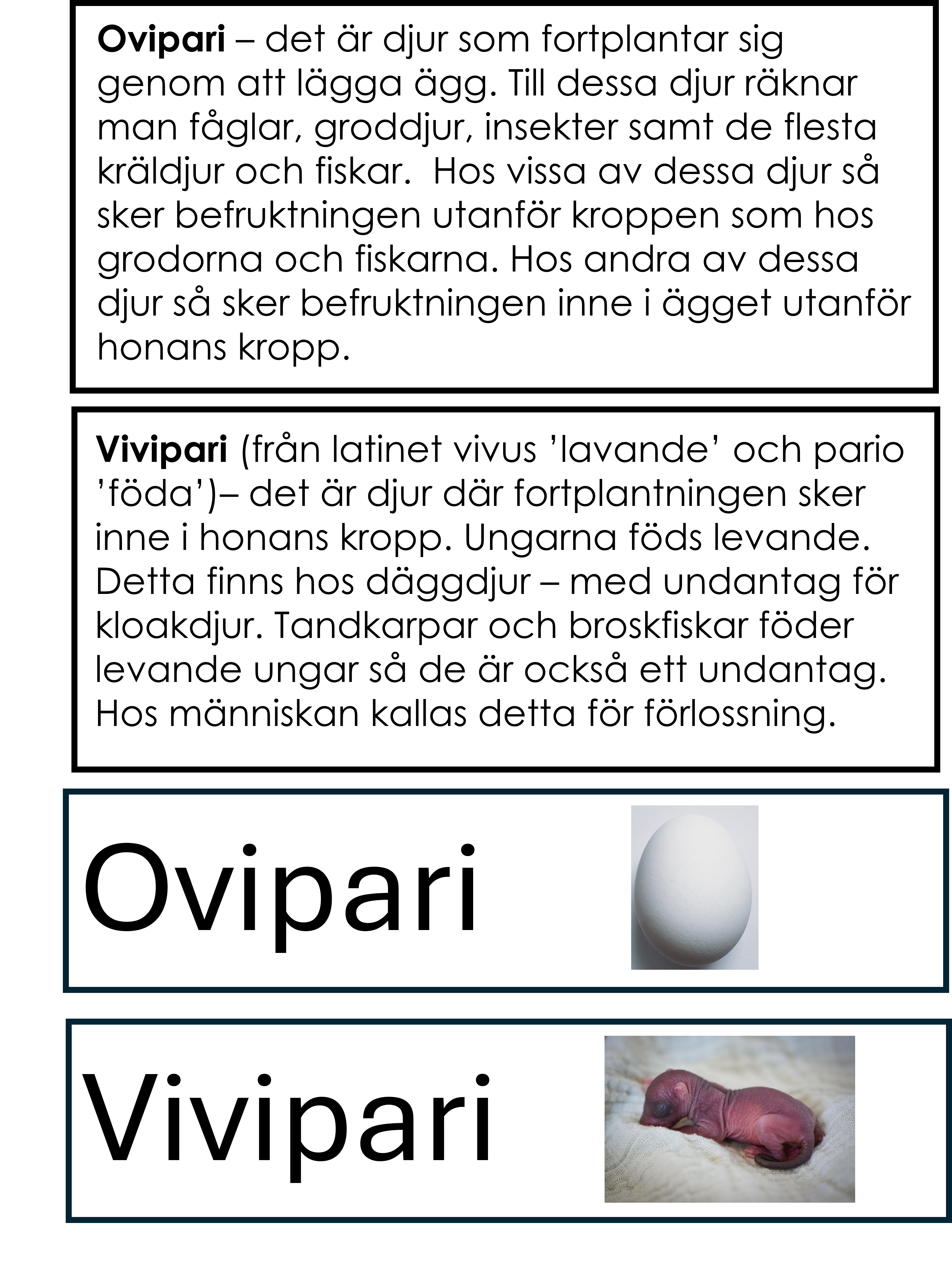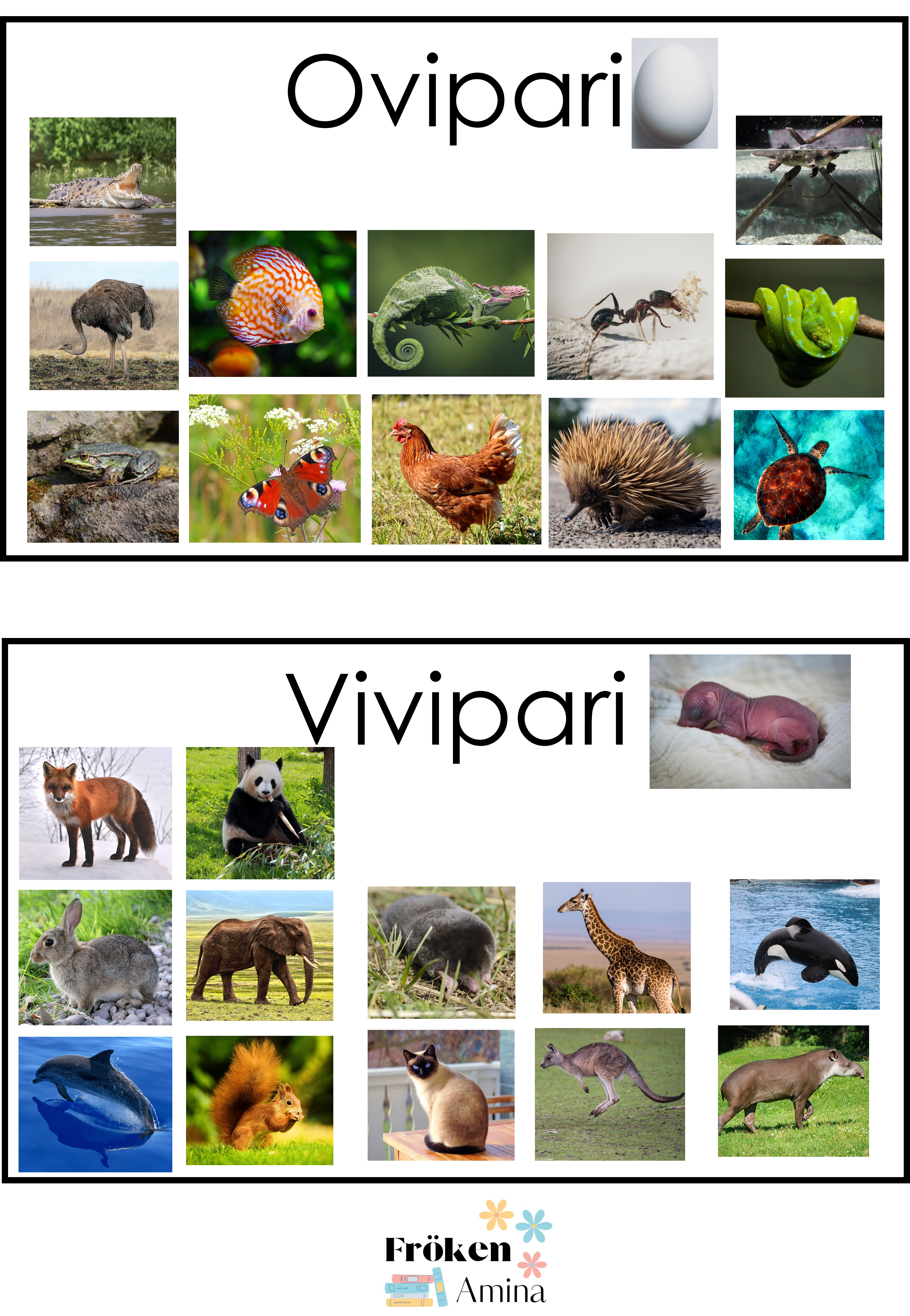 Materialet är ett sorteringsmaterial där barnet ska sortera vilka djur som lägger ägg och vilka djur som föder levande ungar.