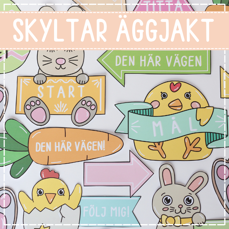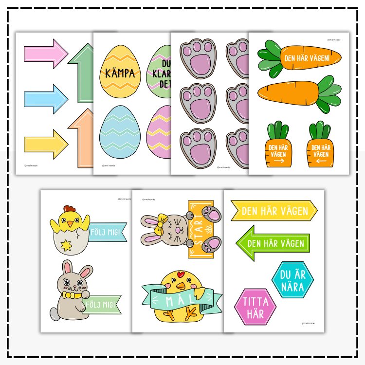 Skyltar och pilar till äggjakten. Placera ut för att hjälpa eleverna hitta påskägget. Innehåller: