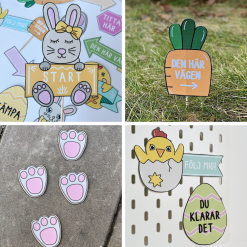 – Skylt för start (hålls i av en påskhare) och skylt för mål (hålls i av en kyckling)