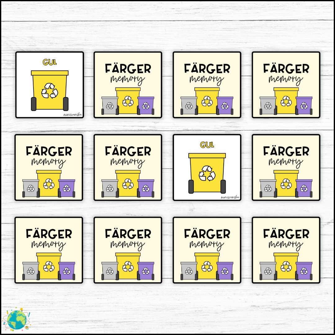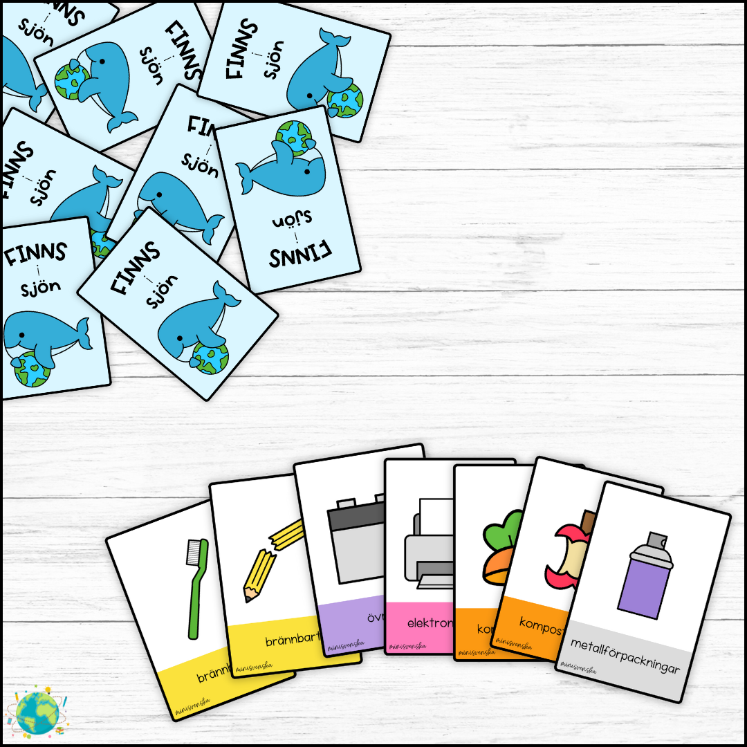 Ett pedagogiskt ”familjespel” dĂ€r barnen samlar fyrtal av olika Ă„tervinningskategorier. StĂ€rker sprĂ„k, struktur och miljökunskap.