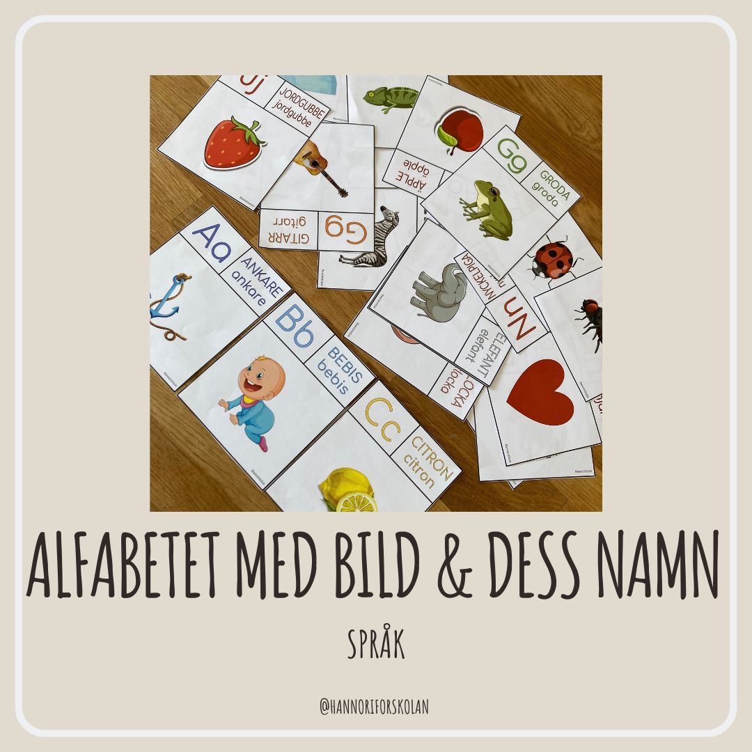 Alfabet med bild och dess namn – sätt upp i den pedagogiska miljön för att synligöra både gemener och versaler. Barnen får möjlighet att se bokstaven kopplat till ord och bild. Ca 13x16cm.