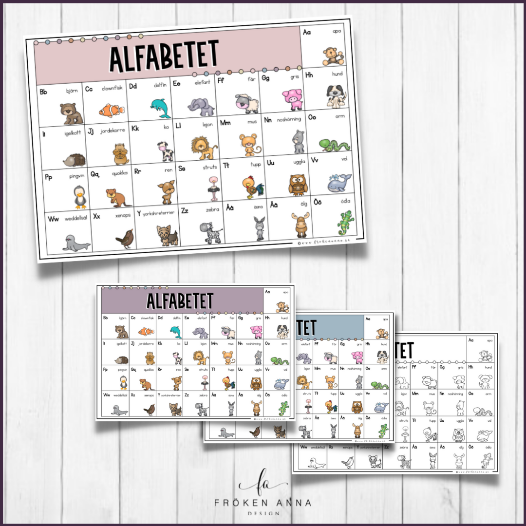 En poster med en förteckning över hela alfabetet med djurtema. I paketet medföljer postern i färg i tre olika färger samt svartvit i både A4 och A5.