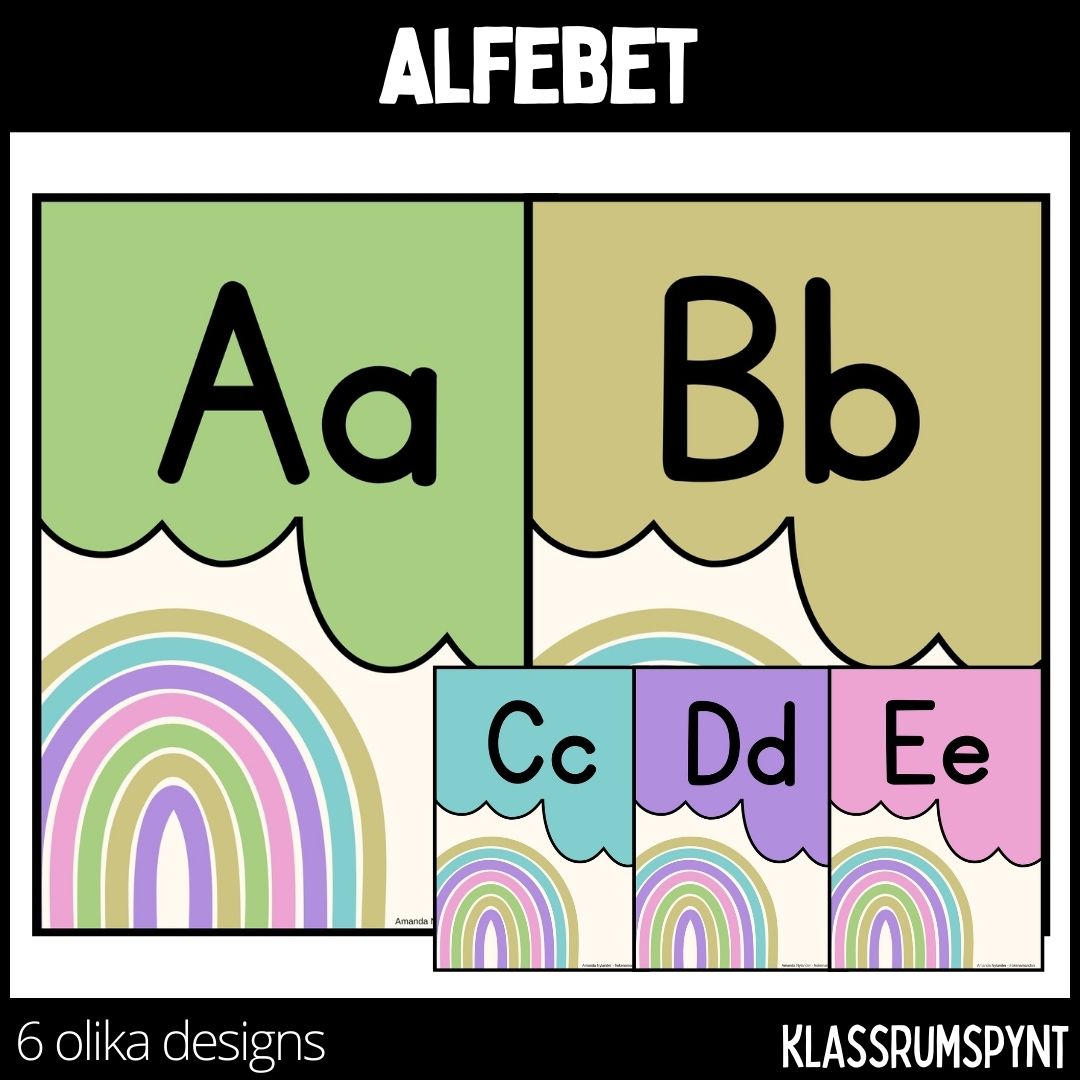 Pynta klassrummet med detta alfabet. Paketet innehåller sex stycken alfabeten med olika designs. Det alfabeten har gemensamt är att de alla har regnbågen som gemensamt tema. Välj det som passar dig bäst.