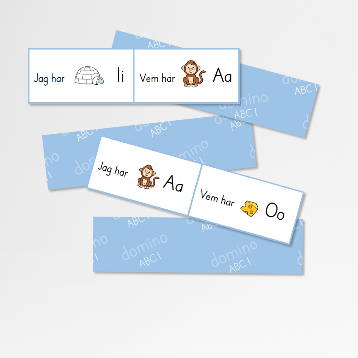 Ett alfabetsdomino med bildstöd för att träna på bokstävernas utseende och ljud. Typsnittet som används ägs av Skolplus AB.