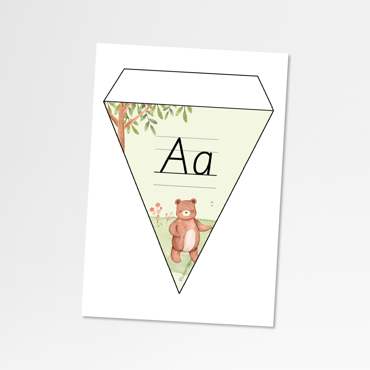 En alfabetsvimpel med stödlinjer och grönt tema för att passa övrigt material till år 1. Typsnittet kommer från Finland och heter Alku. Det är framtaget i Finland för att skapa större skillnad mellan bokstäverna och för att passa modern tid utan anpassning till skrivstil.