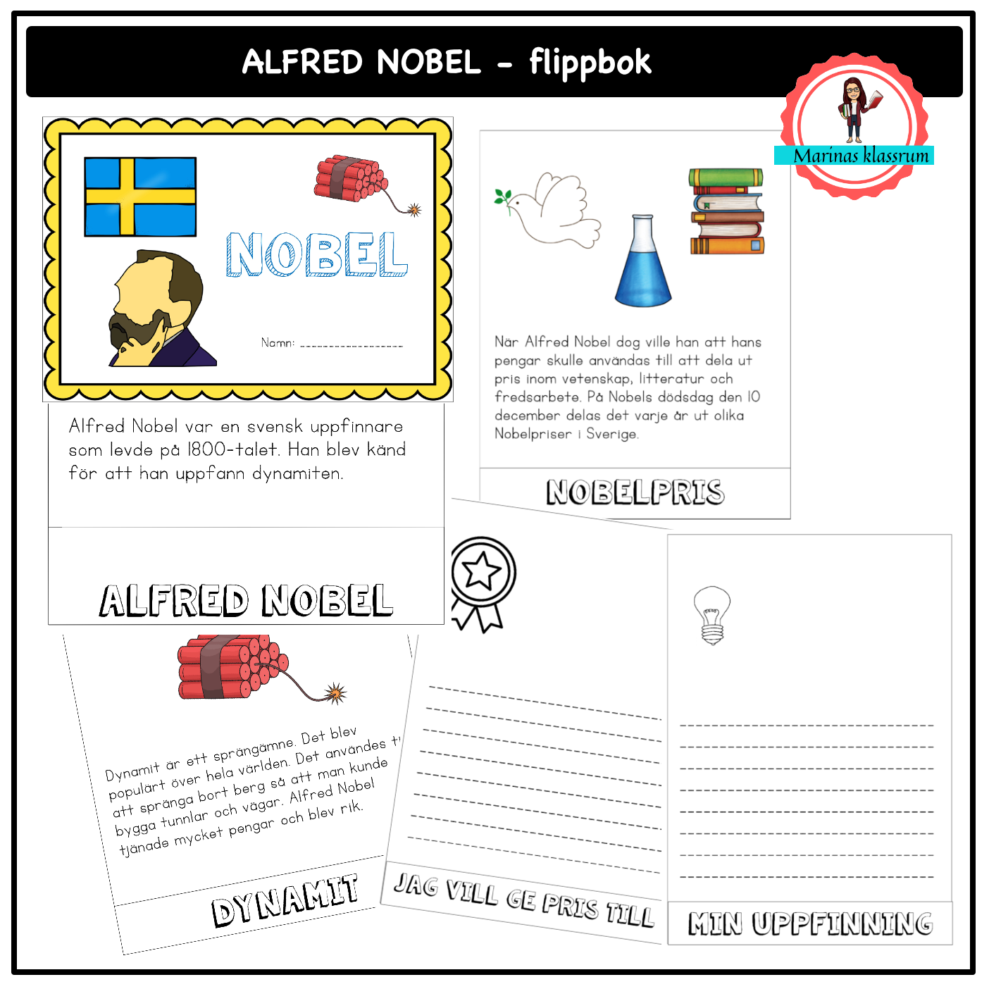 Gör en flippbok kring Nobeldagen och Alfred Nobel. De olika flikarnas rubriker i boken är: Alfred Nobel, dynamit, Nobelpriset, min uppfinning och jag vill ge pris till. Materielet är både i färg och svartvitt. En exempel bok med förslag till text att skriva för eleverna följer med.