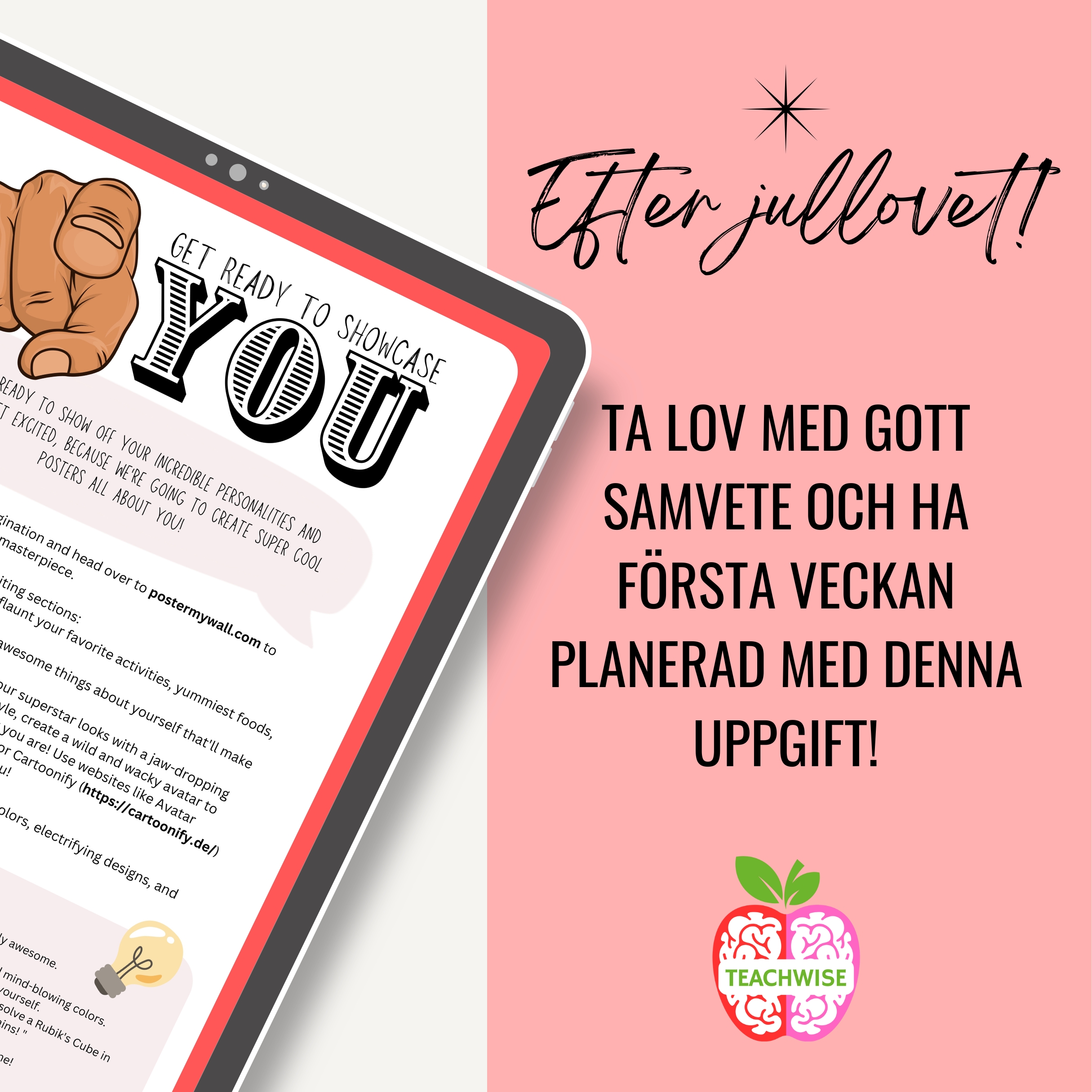 Instruktionerna är tydliga och strukturerade för att göra det enkelt för eleverna att skapa sina digitala posters. Dessutom inkluderas ett exempel för att inspirera och visa ett sätt att presentera sig själva.