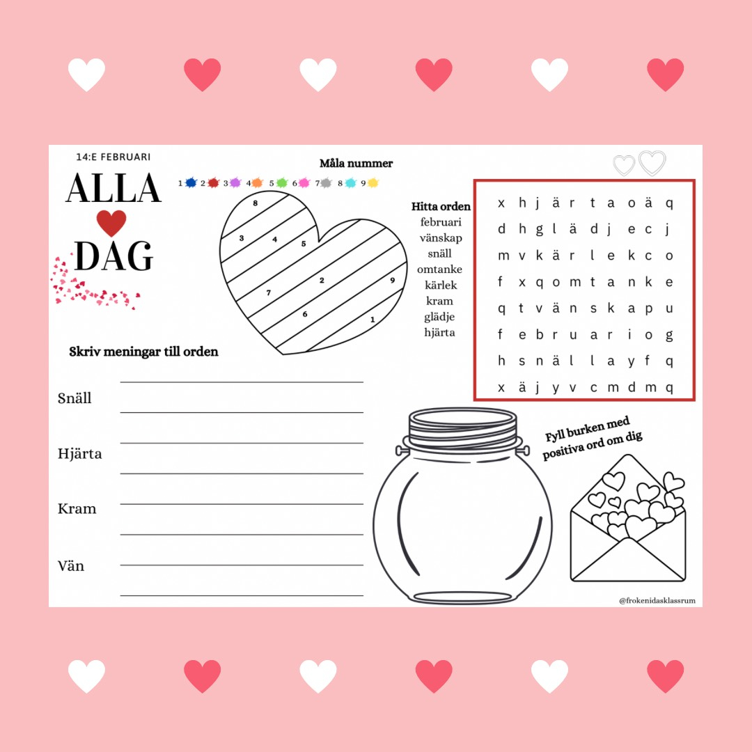 Ett arbetsblad med uppgifter till alla hjÀrtans dag med: