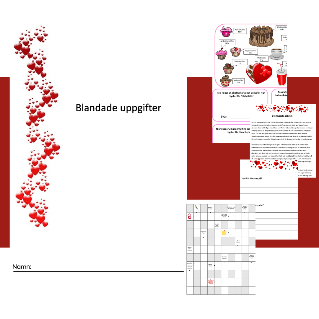 Ett häfte med blandade uppgifter. Alla hjärtans dag inpirerat men går lika bra att använda även när det inte är februari. 20 sidor. Två texter med olika svårighetsgrad för träning av läsförståelse.