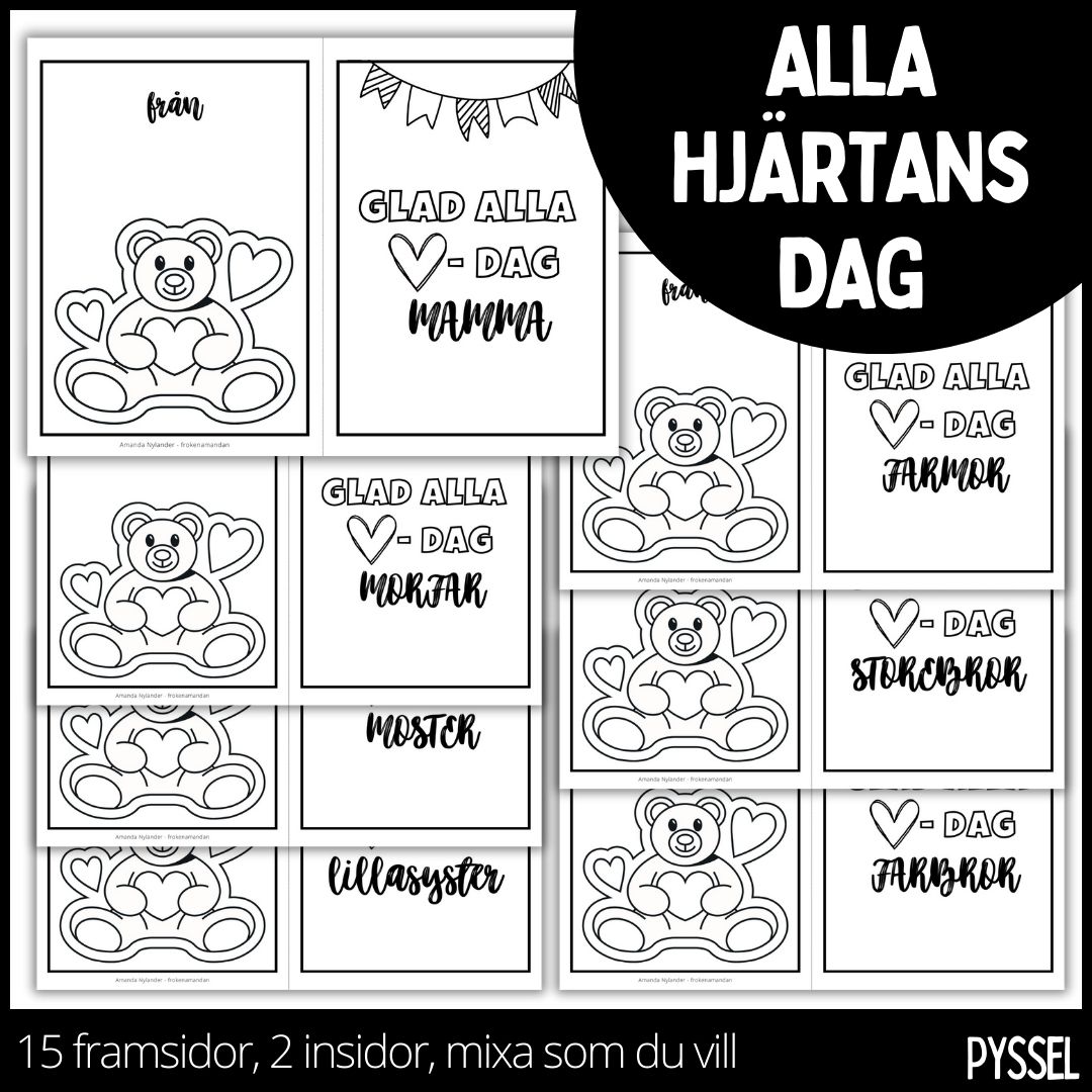 Låt eleverna skriva ett kort till någon de tycker om med hjälp av dessa mallar. I materialet ingår 15 framsidor och 2 insidor som du kan mixa och matcha som du vill. Temat på dessa kort är ”glad alla hjärtans dag”.