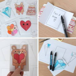 Pyssel till alla hjärtans dag: mallar till fem öppningsbara alla hjärtans dag-kort att färglägga, klippa ut och vika ihop. I kortet skriver du själv ett eget personligt meddelande.