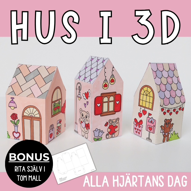 Mallar för att pyssla hus med tema alla hjärtans dag. Färglägg, klipp ut och limma ihop till hus i 3D.