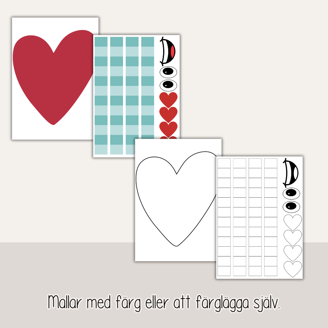 Pyssla ett roligt sprattelhjärta till alla hjärtans dag. Mallarna finns i två versioner, en att färglägga själv och en i färg.