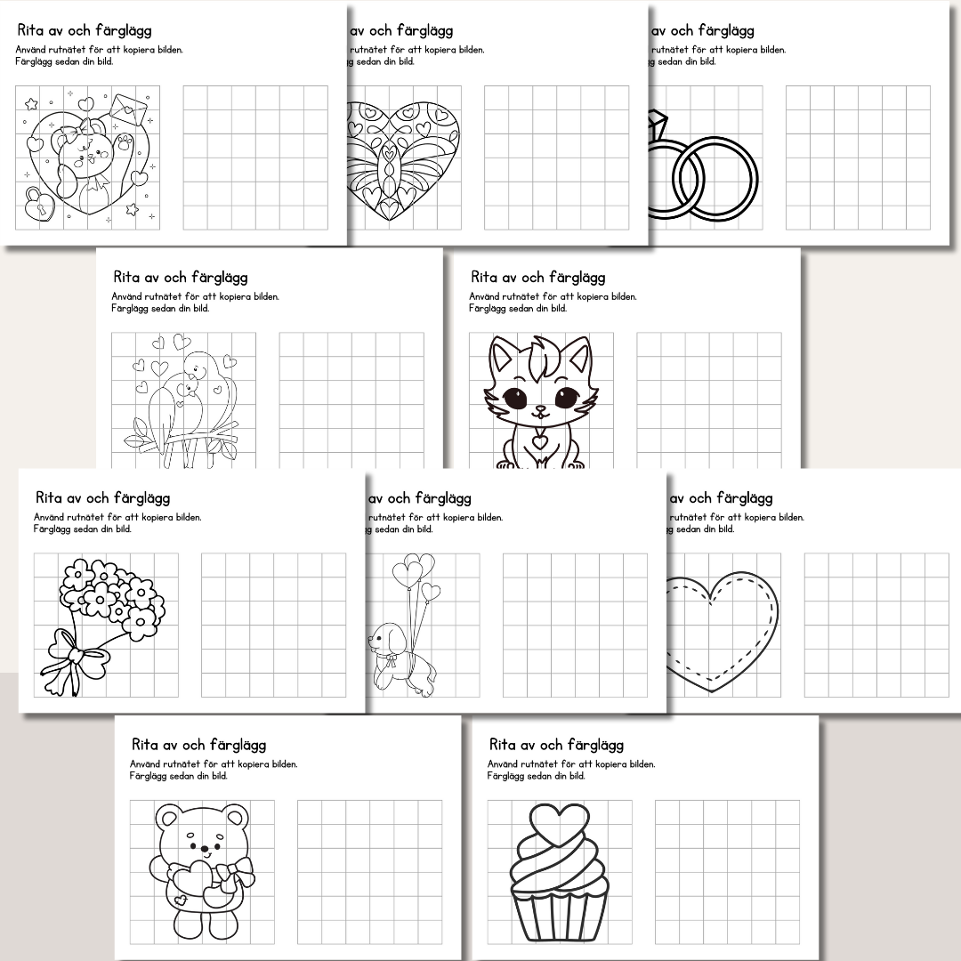 Tio olika bilder att rita av och färglägga med Alla hjärtans dag-motiv