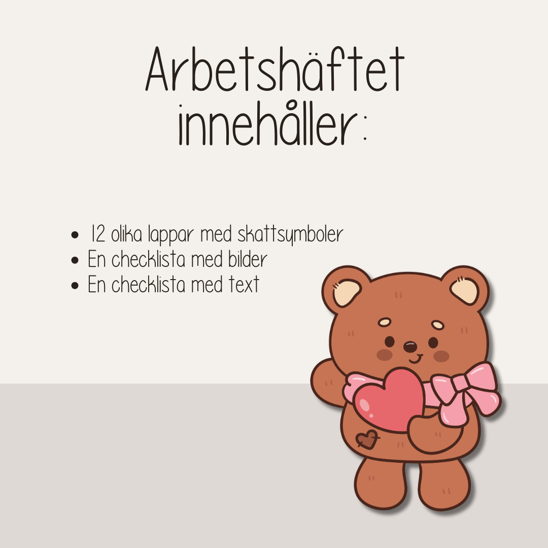 Klipp ut 12 olika lappar och sätt upp på olika platser. Ge eleverna en checklista, den finns med bilder eller med text, sedan är det bara att ge sig ut på skattjakt!