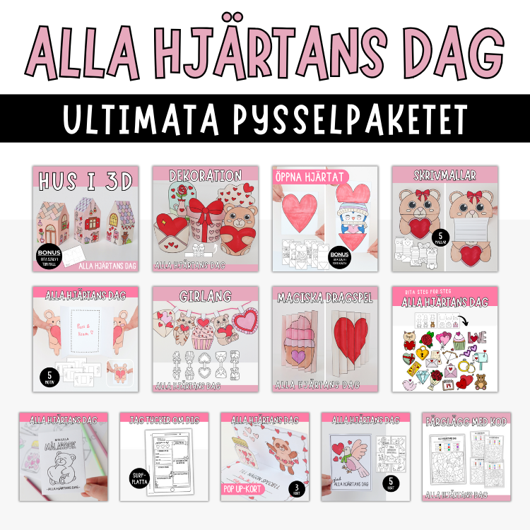 Pysselpaket till alla hjärtans dag! Innehåller 13 pysselkit till ett rabatterat pris. Färglägg, rita och pyssla med barnen inför alla hjärtans dag.