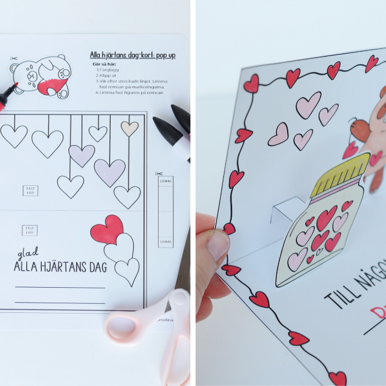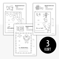 Låt barnen färglägga pop up-kort till hjärtans dag-kort. Klipp och limma fast en figur som blir att stå ut från kortet. Innehåller tre olika kort: hjärtan, nalle och blommor.