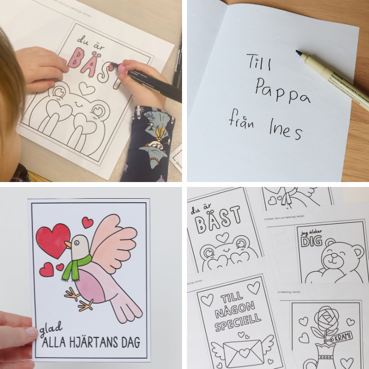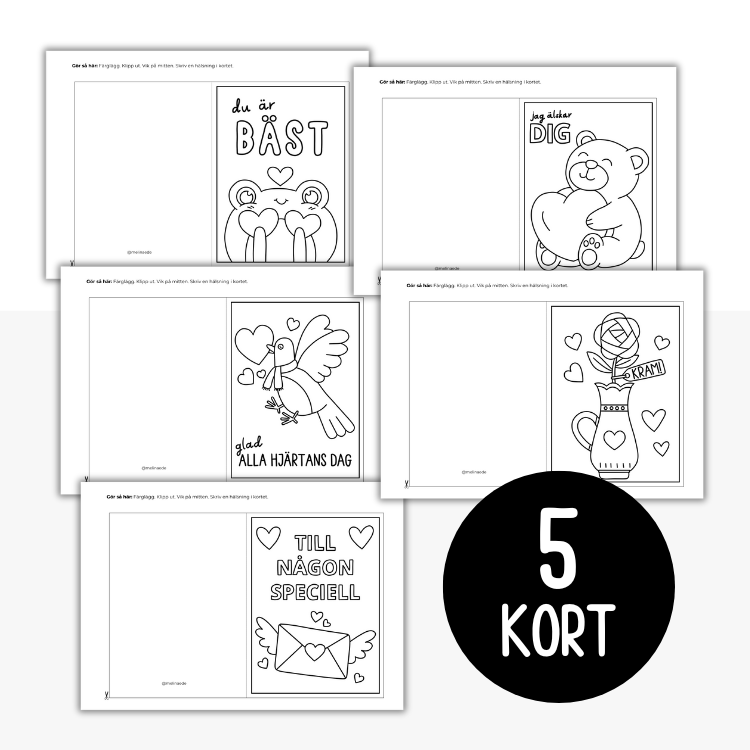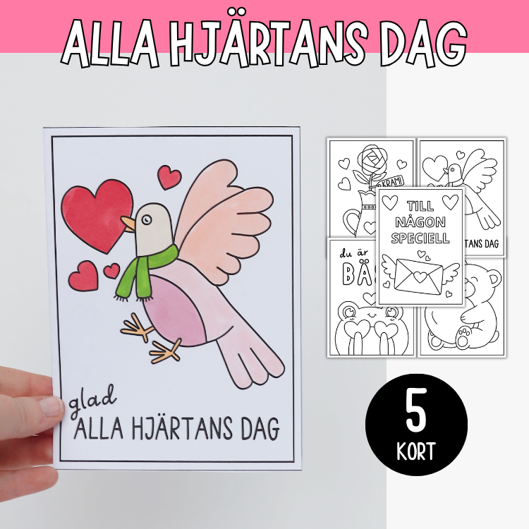Låt barnen färglägga alla hjärtans dag-kort. Korten är vikbara, skriv en egen hälsning inuti. Innehåller fem olika motiv: fågel med hjärta, ros, groda, nalle och kärleksbrev.