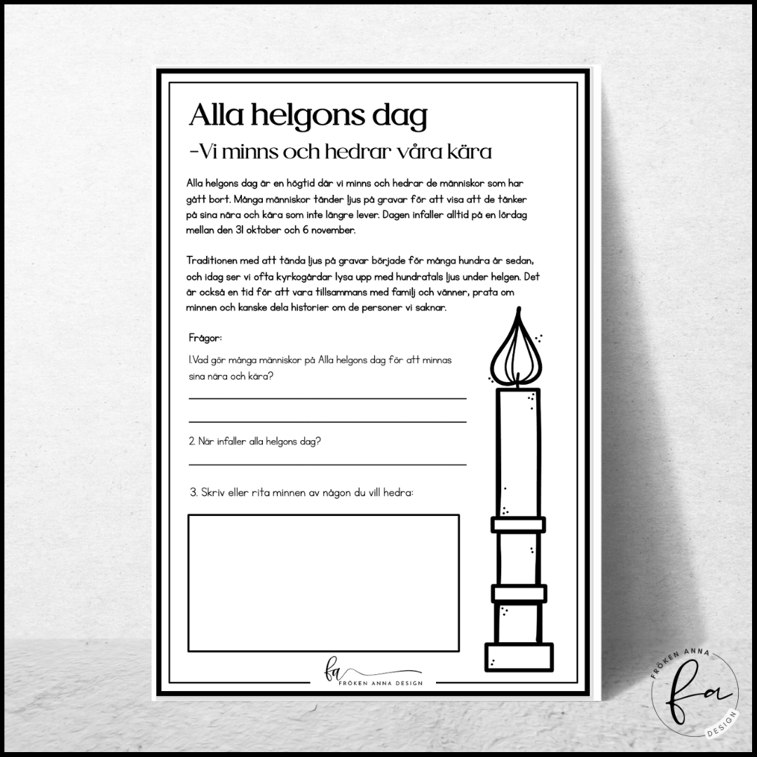- Frågor om vad vi gör på Alla helgons dag och när högtiden infaller, för att stimulera diskussion och reflektion.