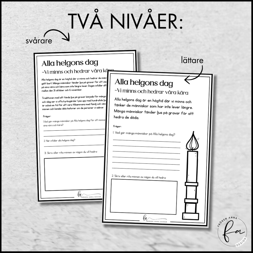 Detta material är ett utmärkt sätt att hjälpa eleverna att förstå den kulturella betydelsen av Alla helgons dag, samtidigt som de får utrymme att uttrycka sina egna tankar och känslor kring att minnas och hedra de som gått bort.