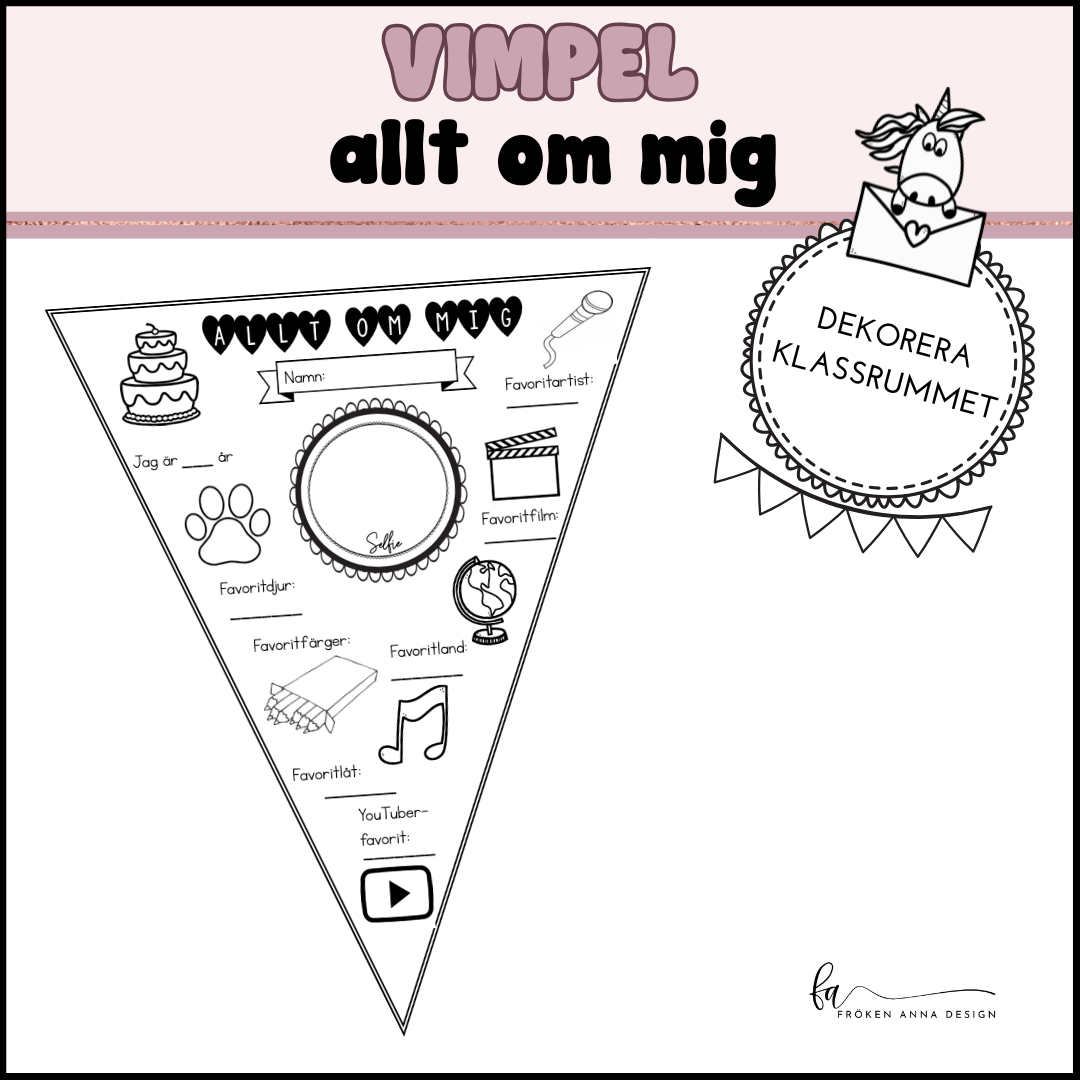 I ”Allt om mig” – vimpeln får eleverna måla sin selfie och fylla i uppgifterna om sig själva. Klipp ut och häng alla elevernas vimplar på en lina i klassrummet.