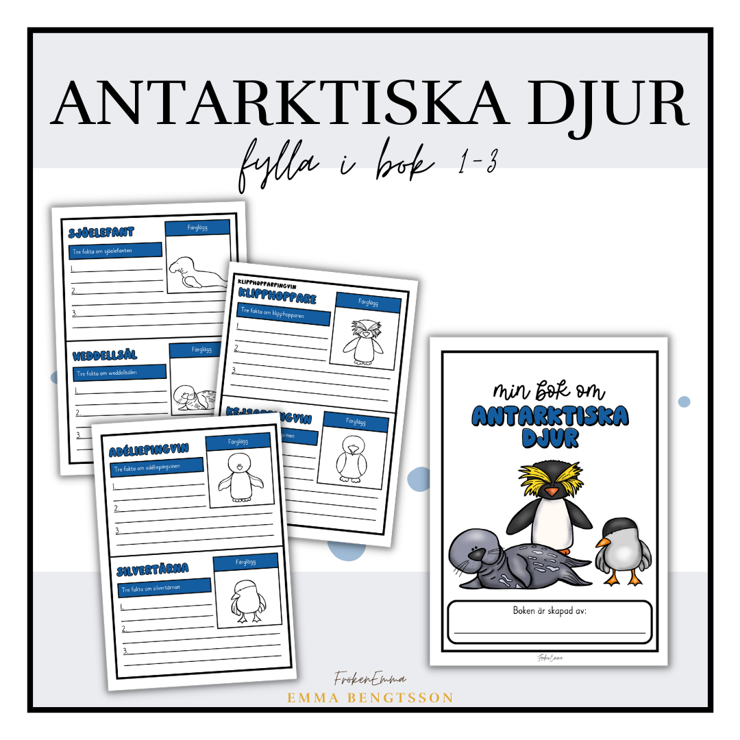 En fylla-i-bok om de intressanta antarktiska djuren. Genom denna bok får eleven befästa några djur som bor på Antarktis och fylla boken med fakta. Boken skrivs ut dubbelsidigt på a4 papper och viks på mitten och häftas ihop. Den innehåller 13 djur som eleven kan lära sig namnen på och skriva tre korta fakta om. Låt eleverna söka på fakta om djuren på sina digitala verktyg. Låt dem söka på valfri fakta eller bestäm tre fakta eleverna ska hitta.