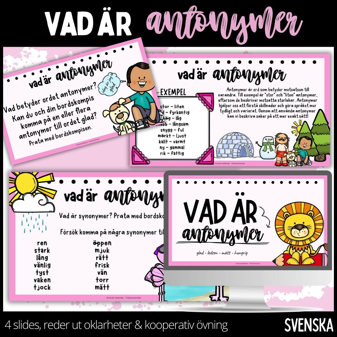 Öva på antonymer med hjälp av denna presentation. Presentationen består av 4 slides som ger dig möjligheten att arbeta kooperativt och språkutvecklande med dina elever. När jag gjort presentationen har jag utgått från Klara svenskan åk 4.