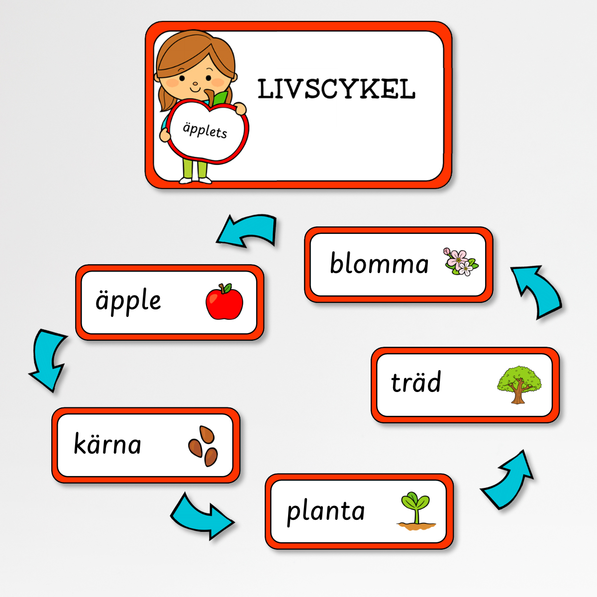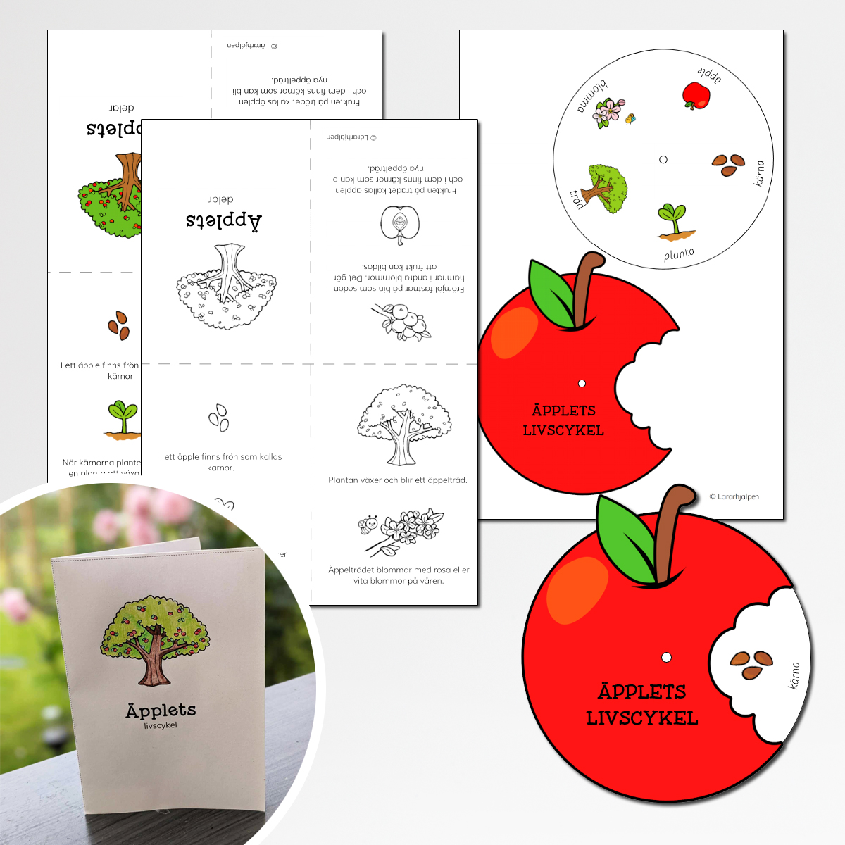 I det här materialpaketet finns allt du behöver när du ska arbeta med äpplets livscykel. Passar perfekt på sensommaren och hösten eller varför inte på äpplets dag den 25 september!