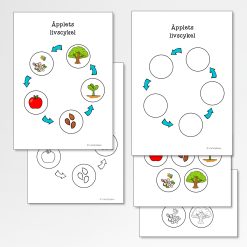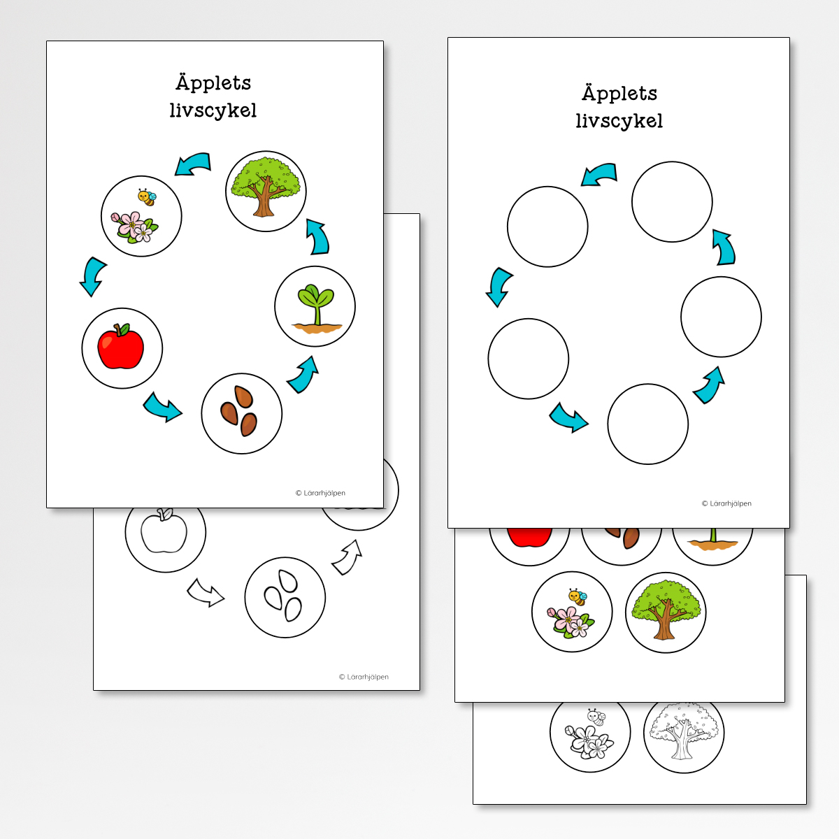 Ett arbetsblad i två varianter; färg och svartvitt, om äpplets livscykel. Eleverna ska klippa ut cirklarna på det separata papperet och klistra in på sitt arbetsblad.