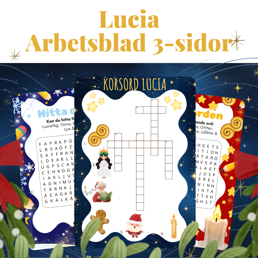 Denna pdf innehåller 3 stycken arbetsblad på temat lucia. Två av sidorna är hitta ordet och den sista sidan är ett korsord. Laminera och återanvänd. Facit medföljer.