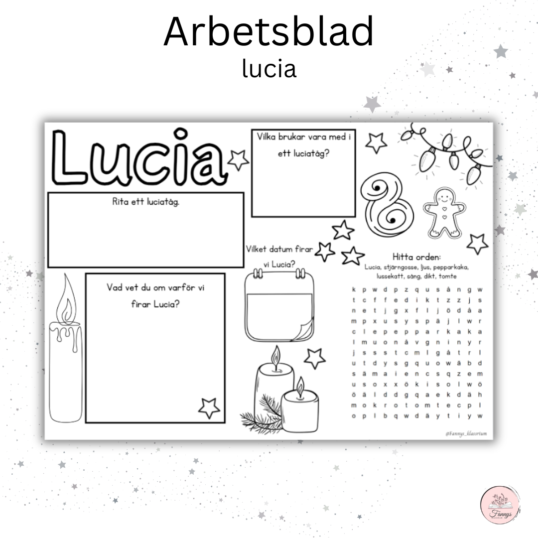 Arbetsblad om lucia där eleverna får skriva, rita och hitta ord i en ordgömma.