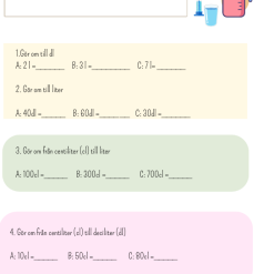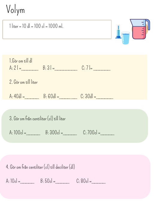 Arbetsblad om volym. Tränar omvandling. Inga decimaltal.