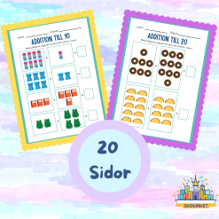 Arbetsbok för förskoleklassen med 20 sidor addition från siffrorna 2 till 20. 5 sidor vardera med tal upp till 5, 10, 15 och 20