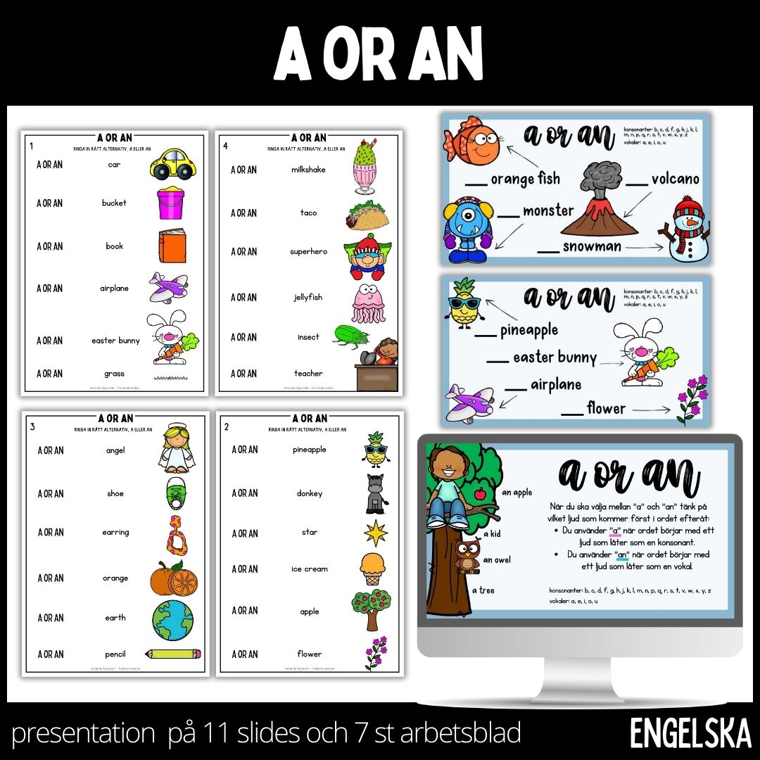 Ett materialpaket innehållandes en presentation på 11 slides och 7 st tillhörande arbetsblad. Låt eleverna öva på a och an med hjälp av materialpaketet. Gå igenom de grammatiska regler som finns kring a och an, stöt och blöt kunskapen tillsammans och låt sedan eleverna jobba enskilt med arbetsbladen för att se om kunskapen befästs.