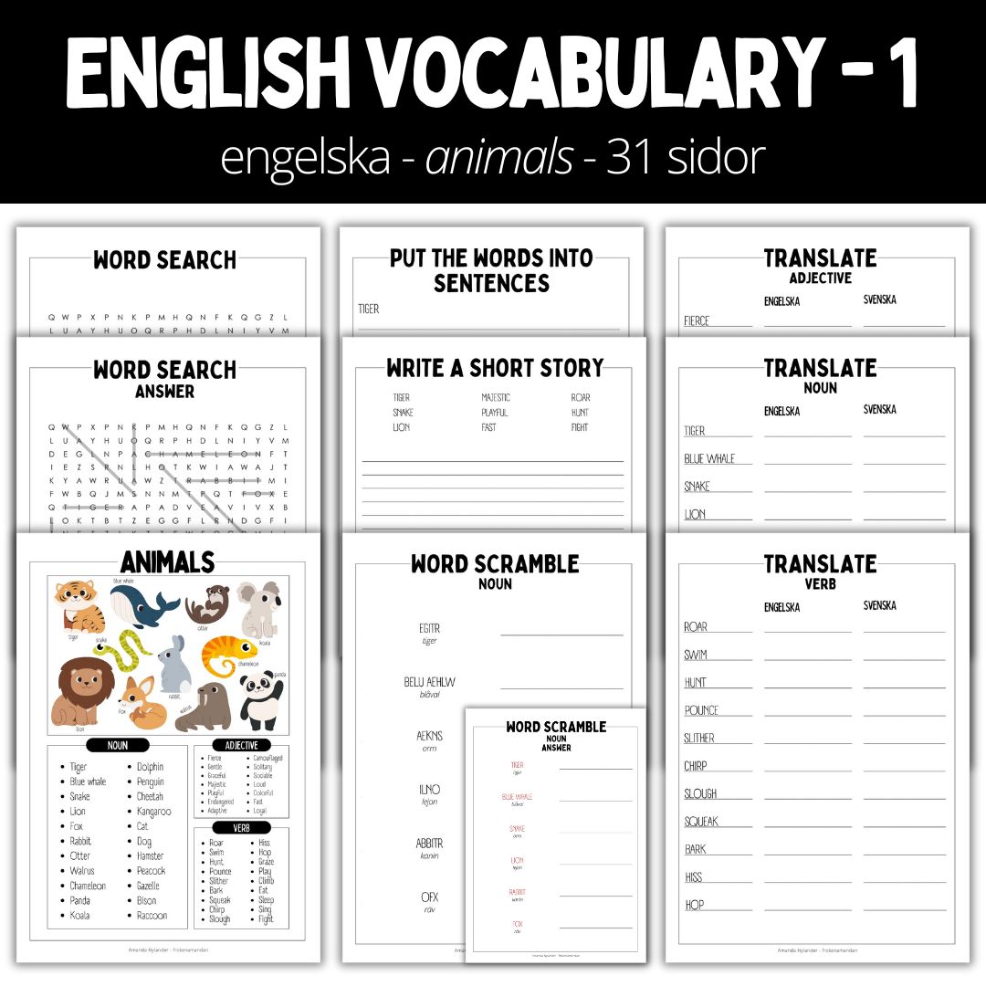 Ett arbetshäfte på 31 varav sex sidor är facit. Fokus ligger på att utveckla elevens ordförråd i det engelska språket. Arbetshäftet består av åtta olika mallar.